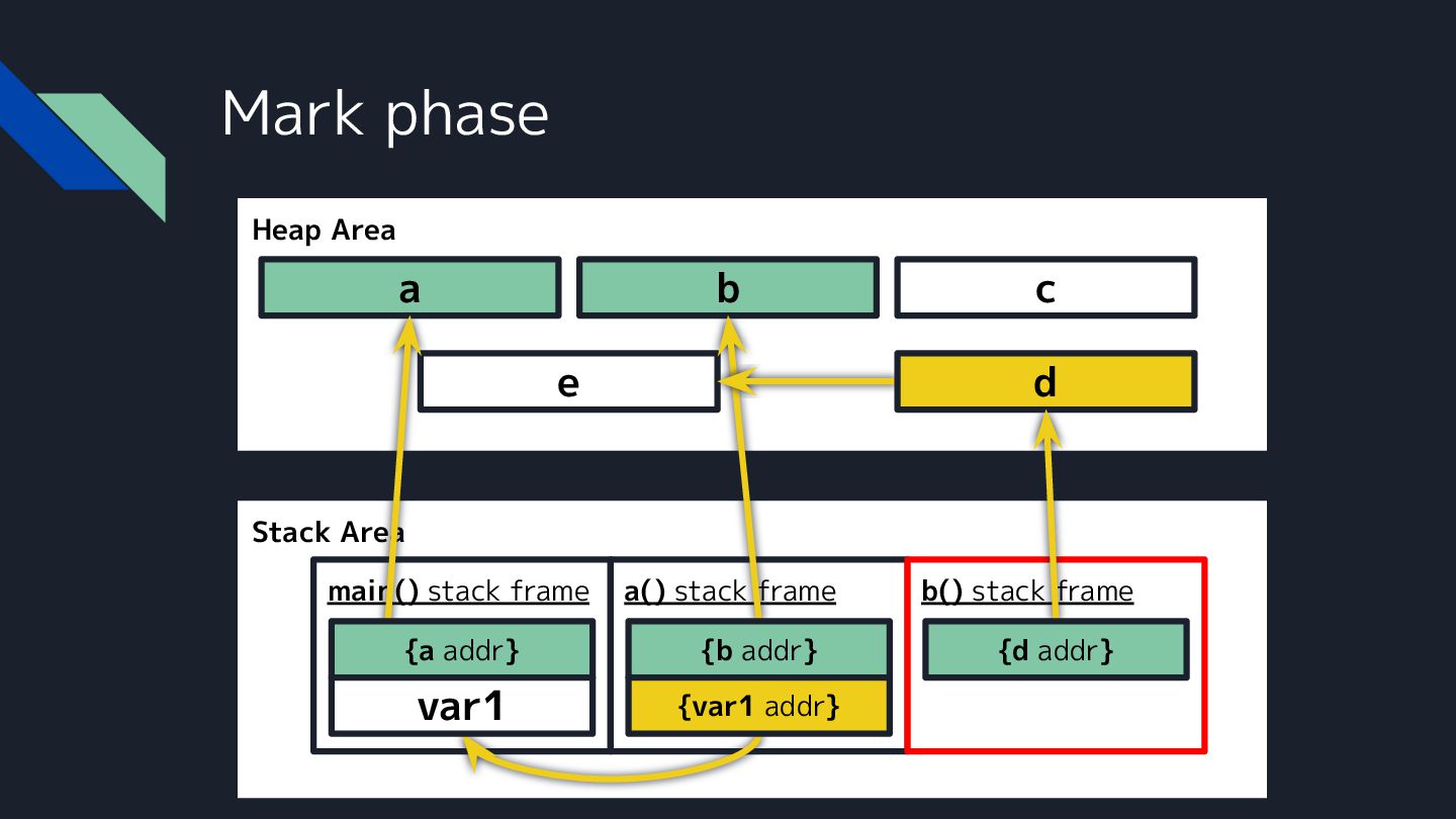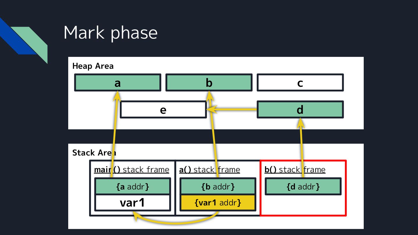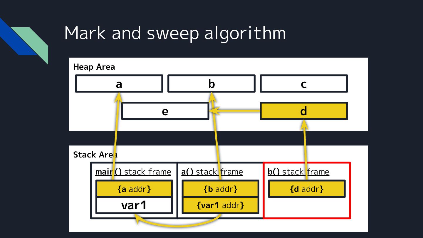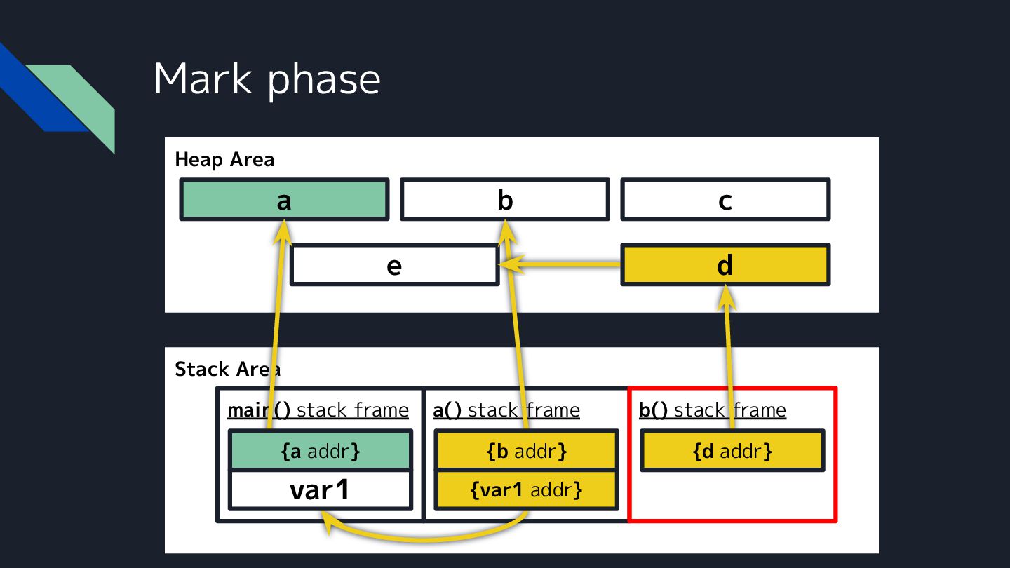 b() stack frame a b e {a addr} d {b addr} {var1 addr} var1 {d addr} Sweep phase