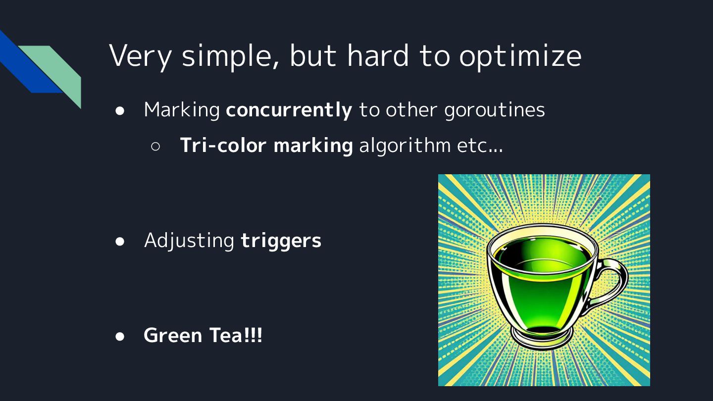 other goroutines ◦ Tri-color marking algorithm etc... • Adjusting triggers • Green Tea!!!