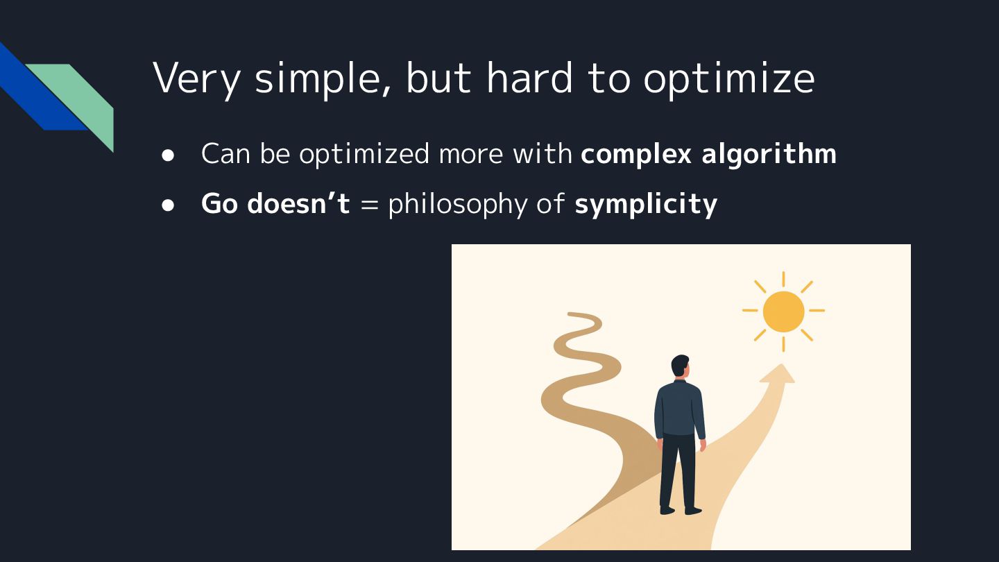 more with complex algorithm • Go doesn’t = philosophy of symplicity