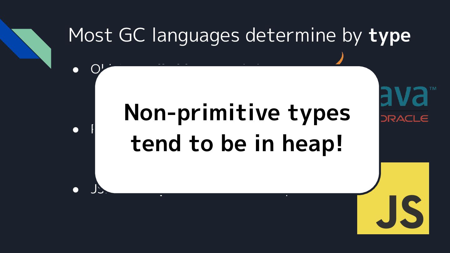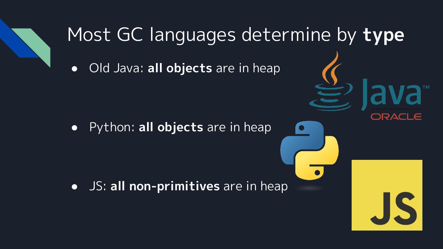 all objects are in heap • JS: all non-primitives are in heap Most GC languages determine by type Non-primitive types tend to be in heap!