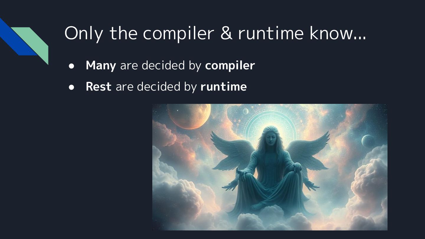 duty • Compiler ◦ Converts your code into binary • Runtime ◦ Runs together with your code during execution