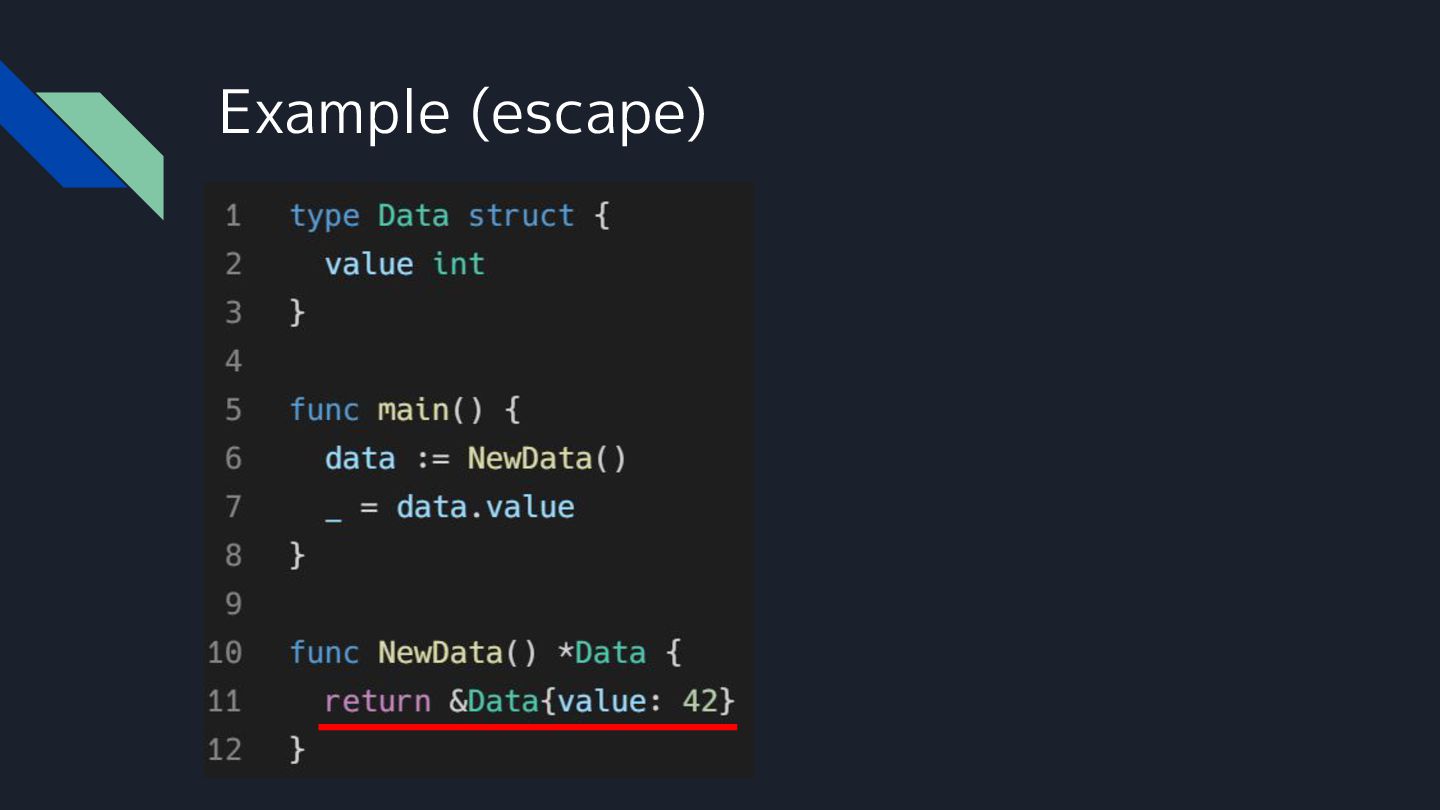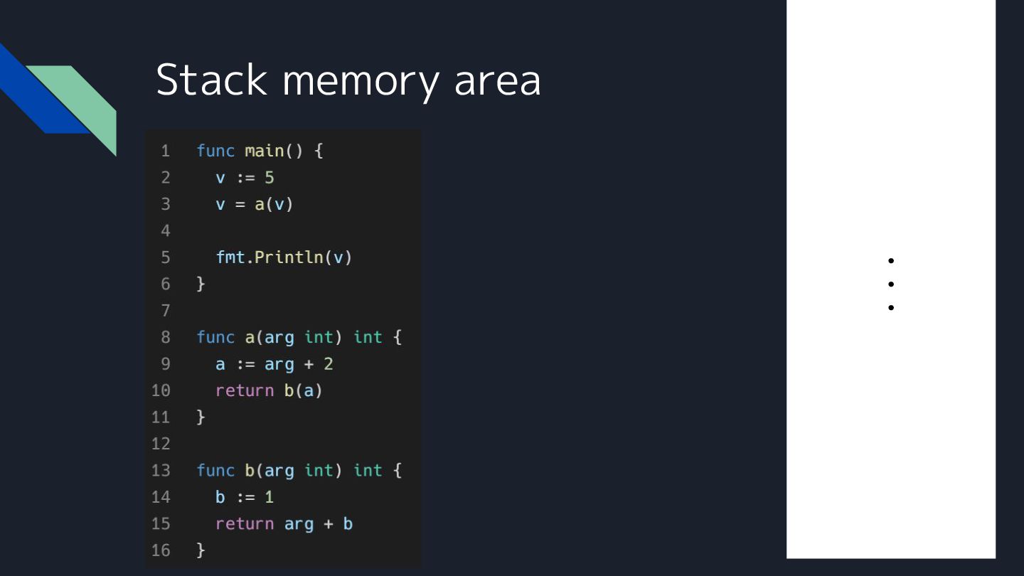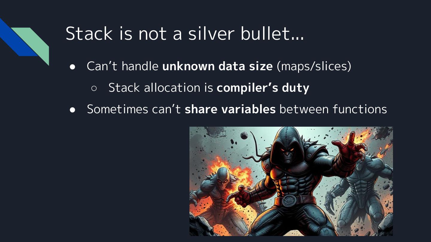 data size (maps/slices) ◦ Stack allocation is compiler’s duty • Sometimes can’t share variables between functions