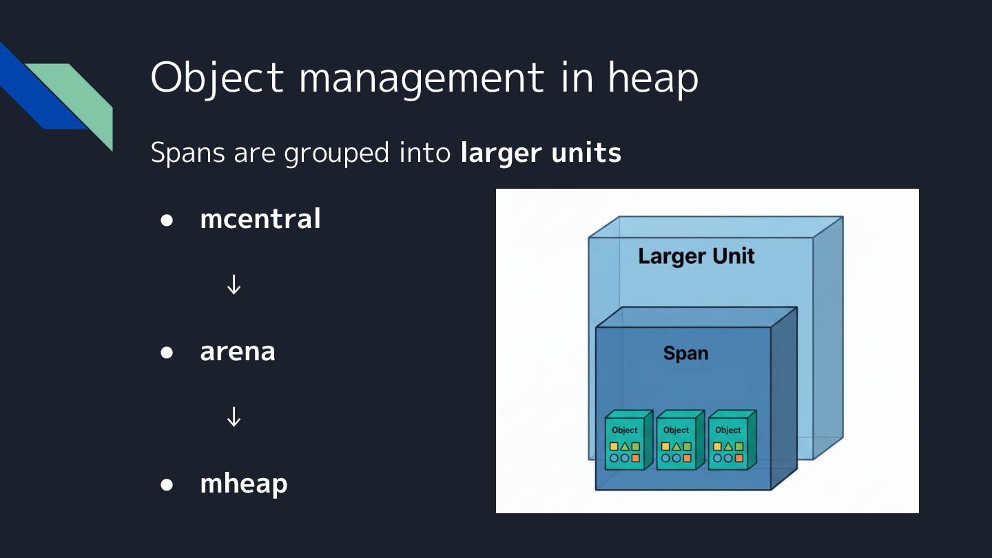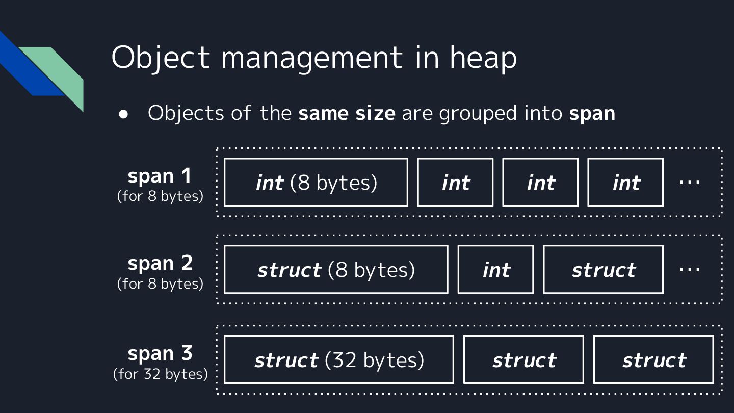 same size are grouped into span int (8 bytes) struct (8 bytes) struct struct (32 bytes) struct struct int int span 1 (for 8 bytes) span 2 (for 8 bytes) span 3 (for 32 bytes) int int