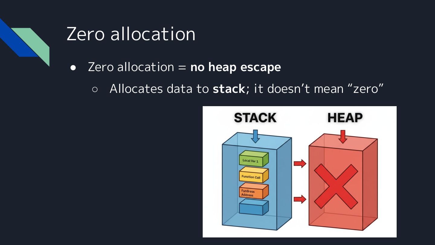 89. Zero allocation • Zero allocation = no heap escape ◦