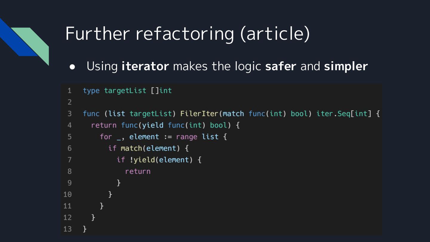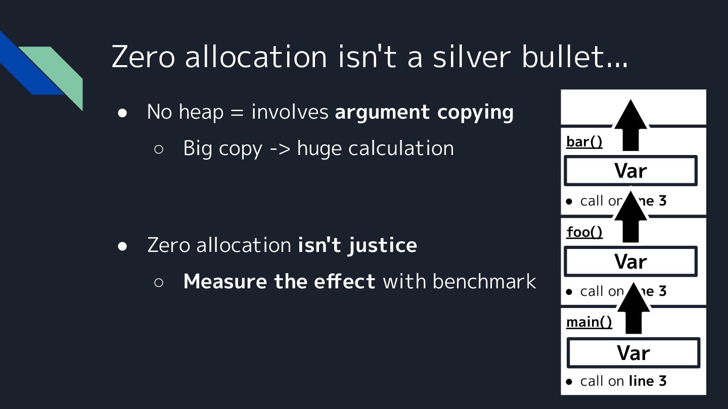 involves argument copying ◦ Big copy -> huge calculation • Zero allocation isn't justice ◦ Measure the effect with benchmark main() • call on line 3 Var foo() • call on line 3 Var bar() • call on line 3 Var