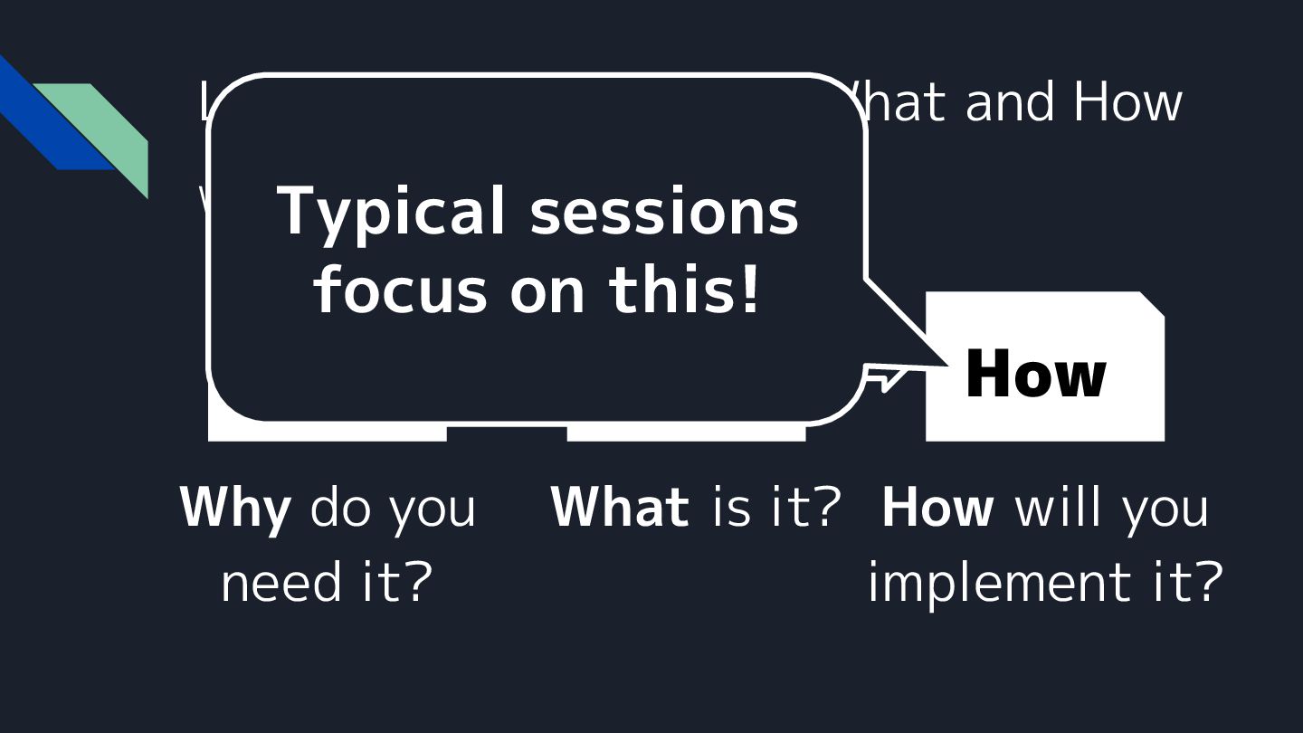 Why, What and How Why Why do you need it? What What is it? How How will you implement it? Typical sessions focus on this!