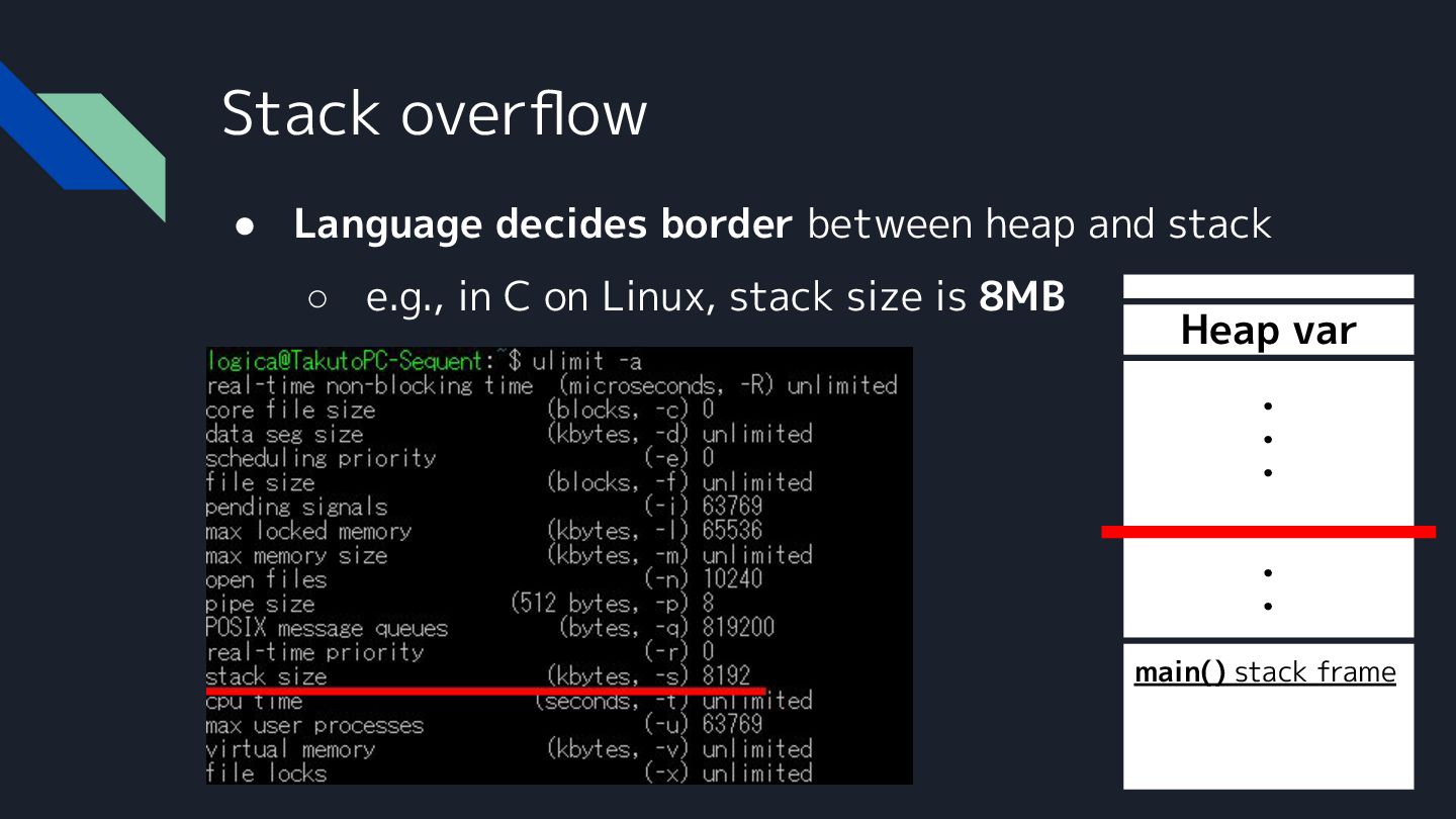 ◦ e.g., in C on Linux, stack size is 8MB . . . . . Heap var main() stack frame