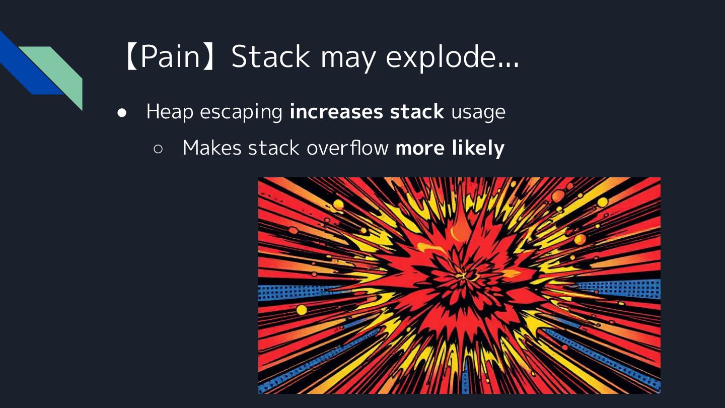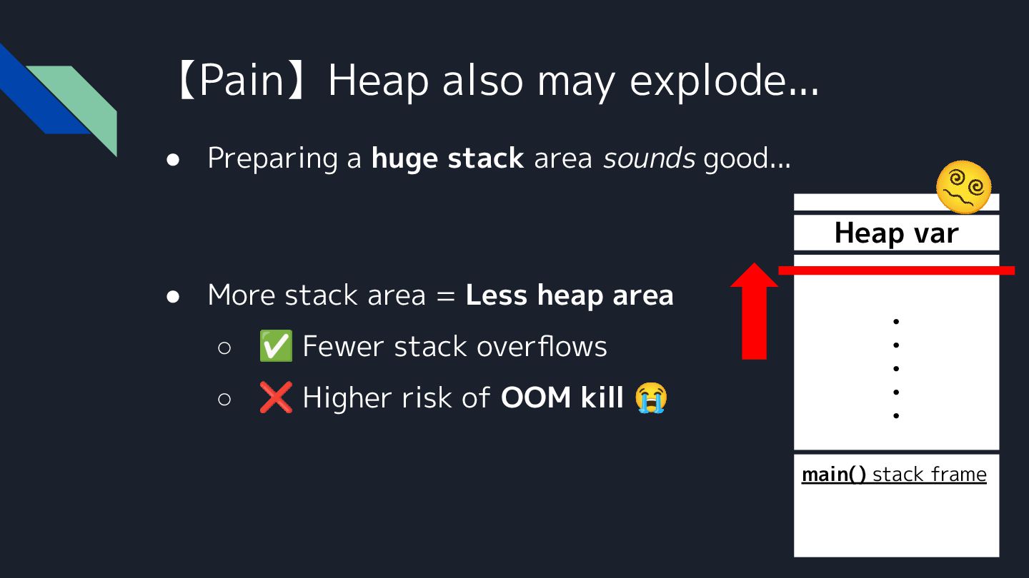 sounds good... • More stack area = Less heap area ◦ ✅ Fewer stack overflows ◦ ❌ Higher risk of OOM kill 😭 . . . . . Heap var main() stack frame 󰷺