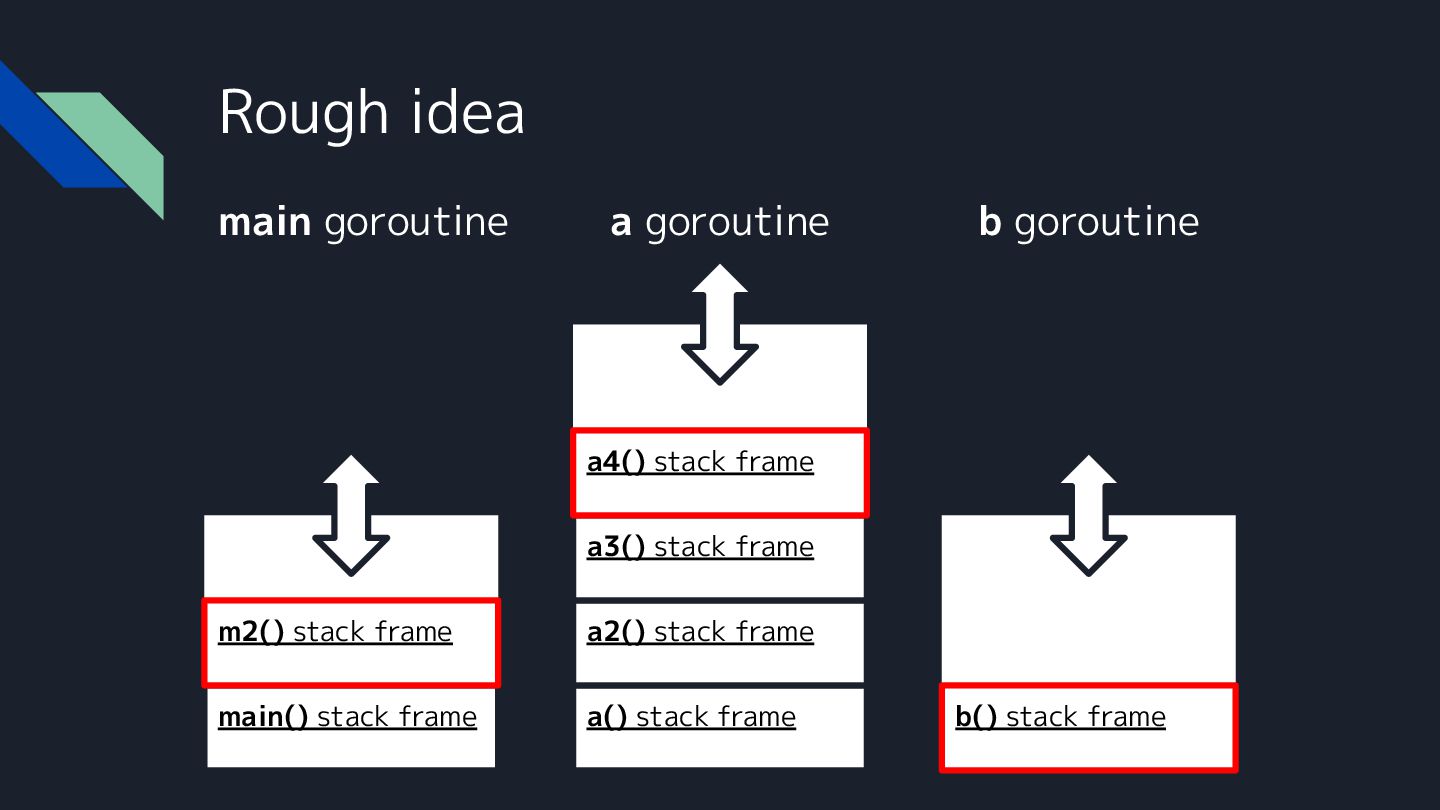 94. Rough idea main goroutine main() stack frame a() stack frame