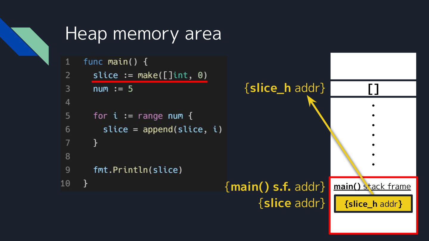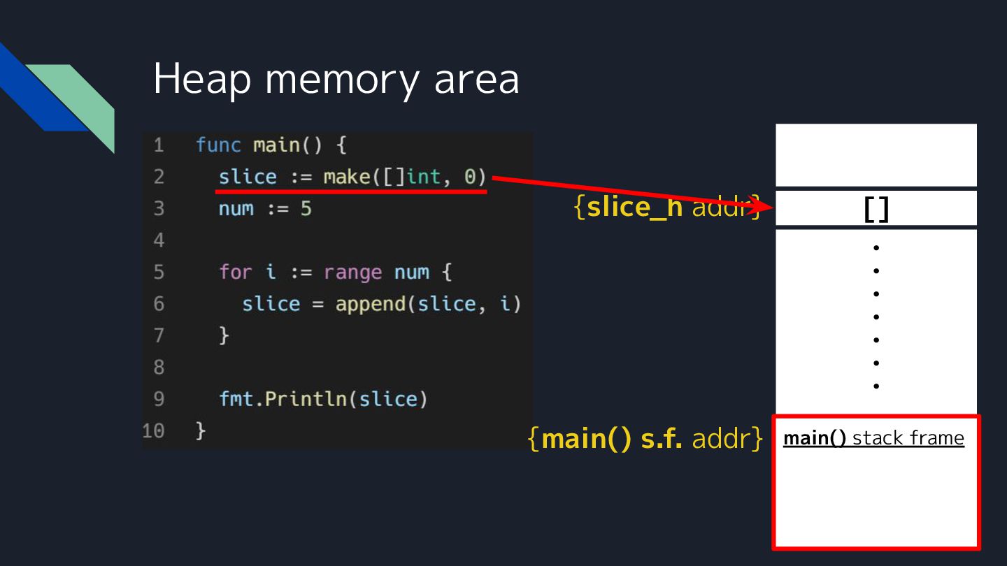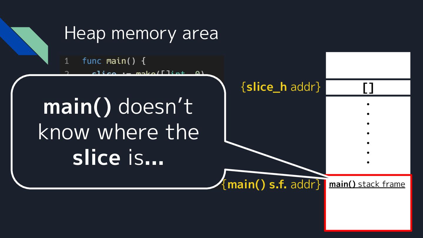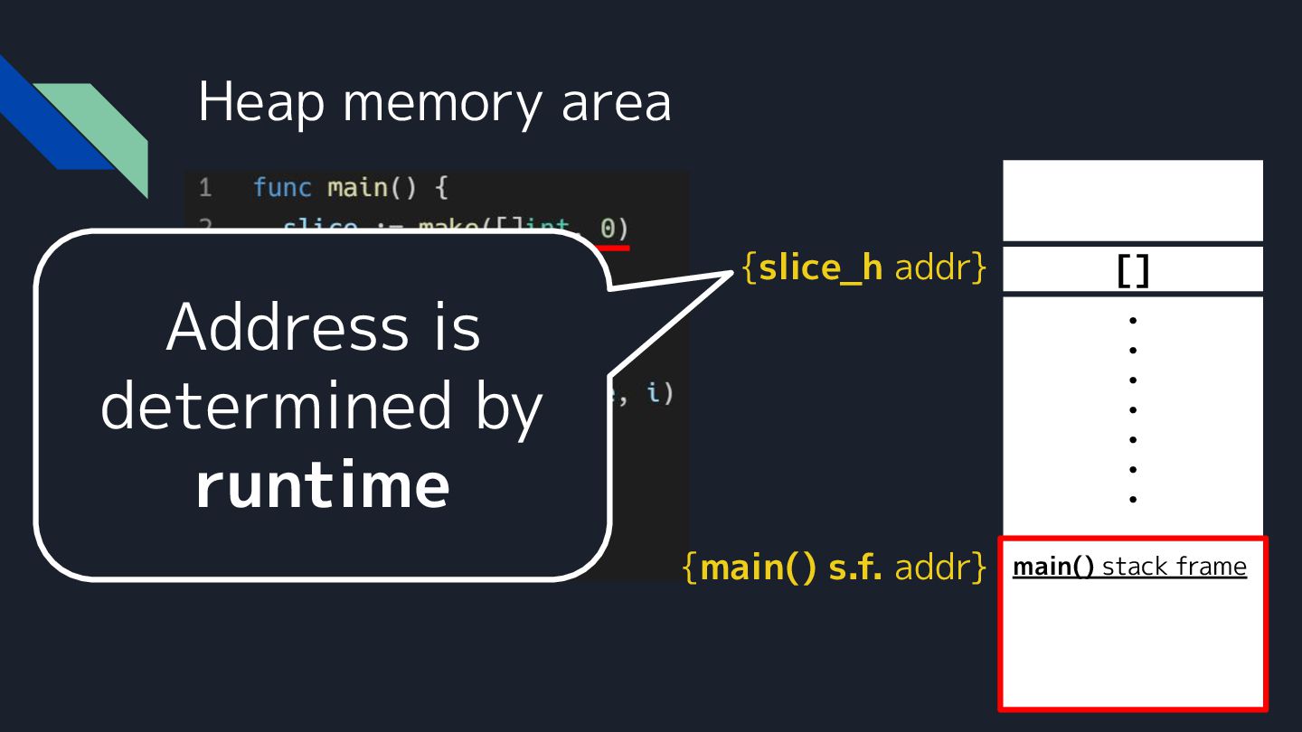 [] {slice_h addr} {main() s.f. addr} main() stack frame Address is determined by runtime