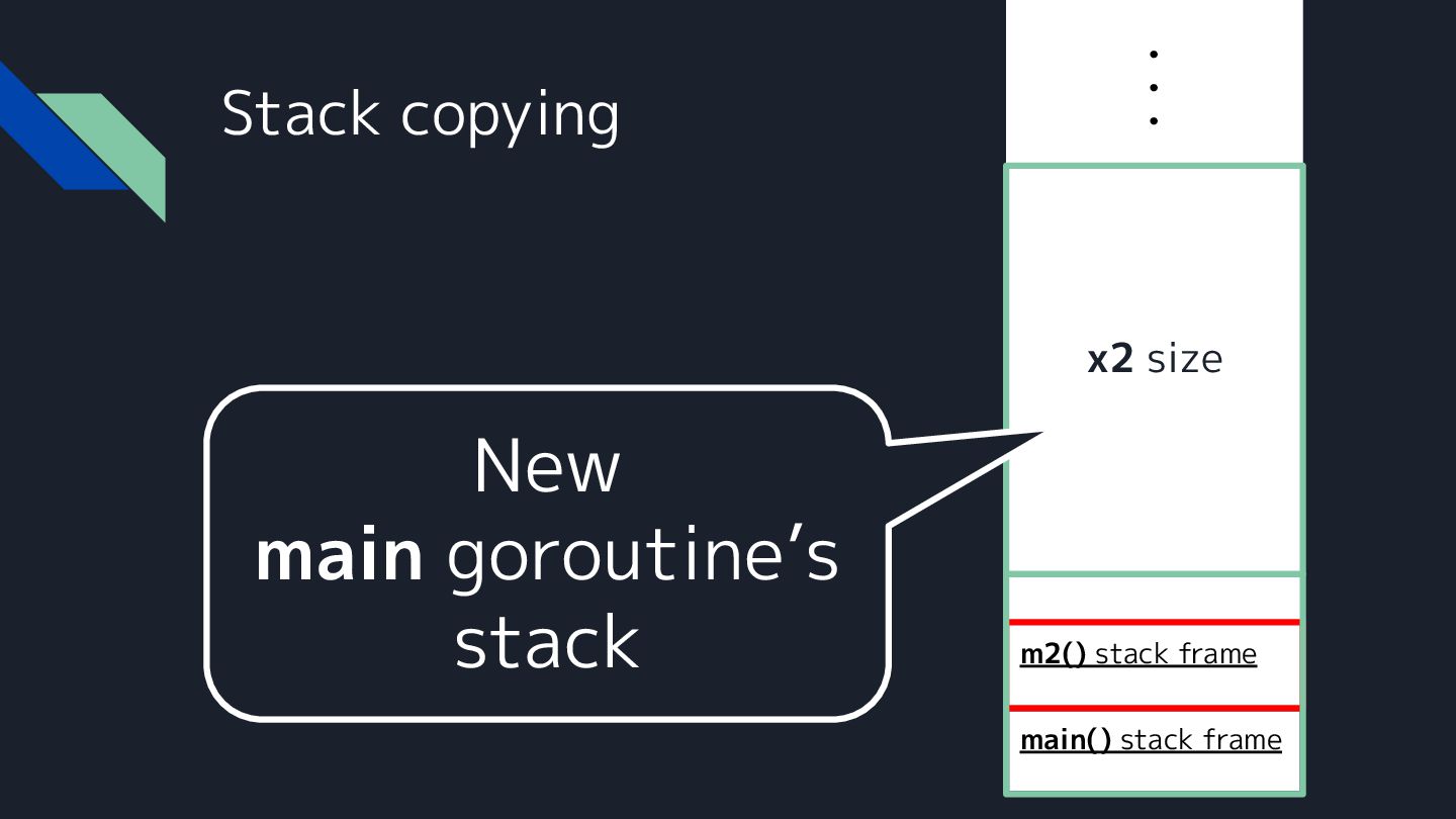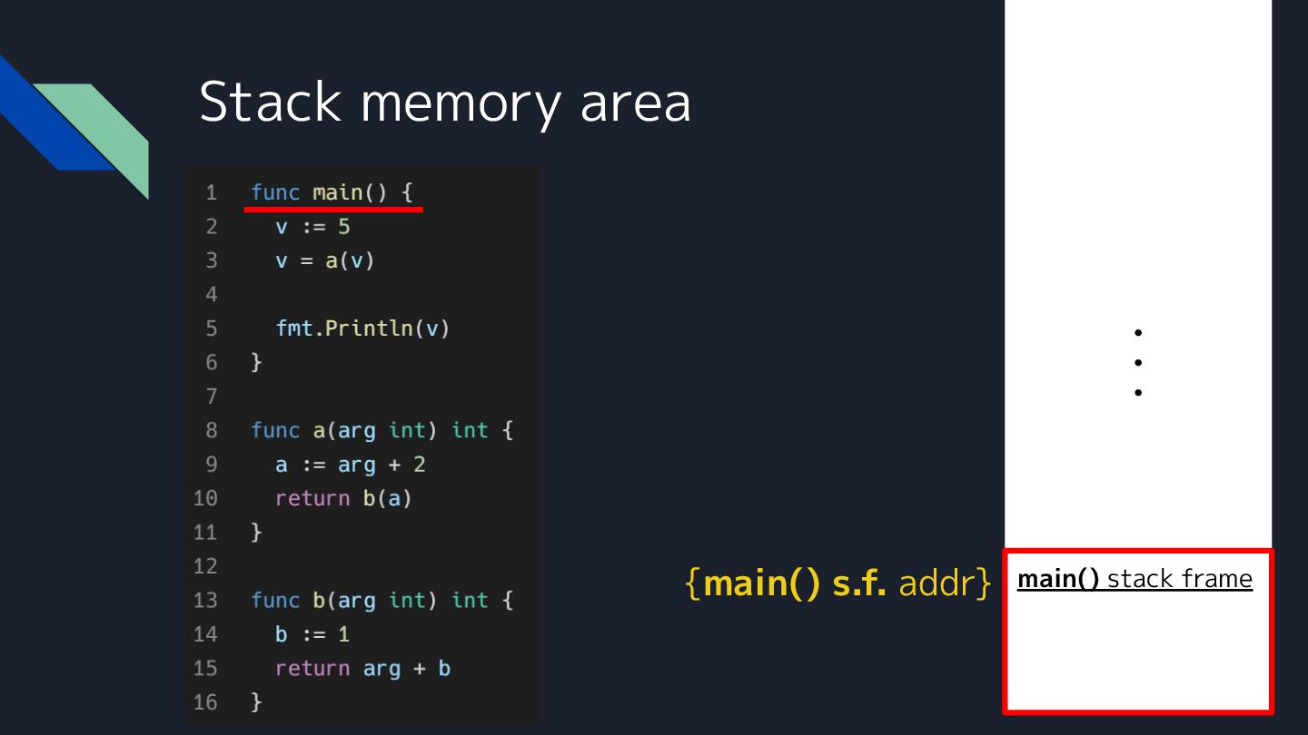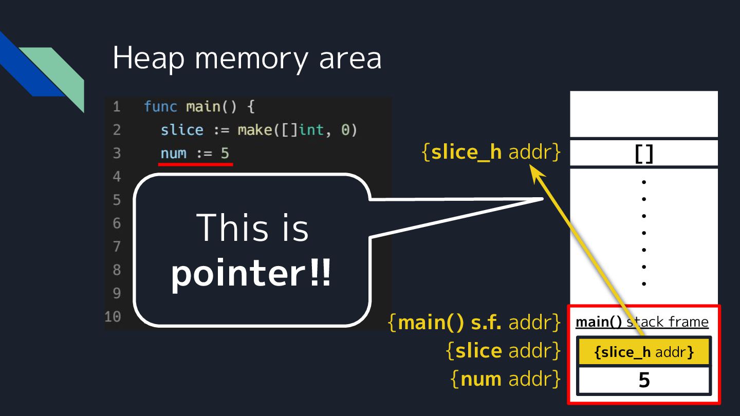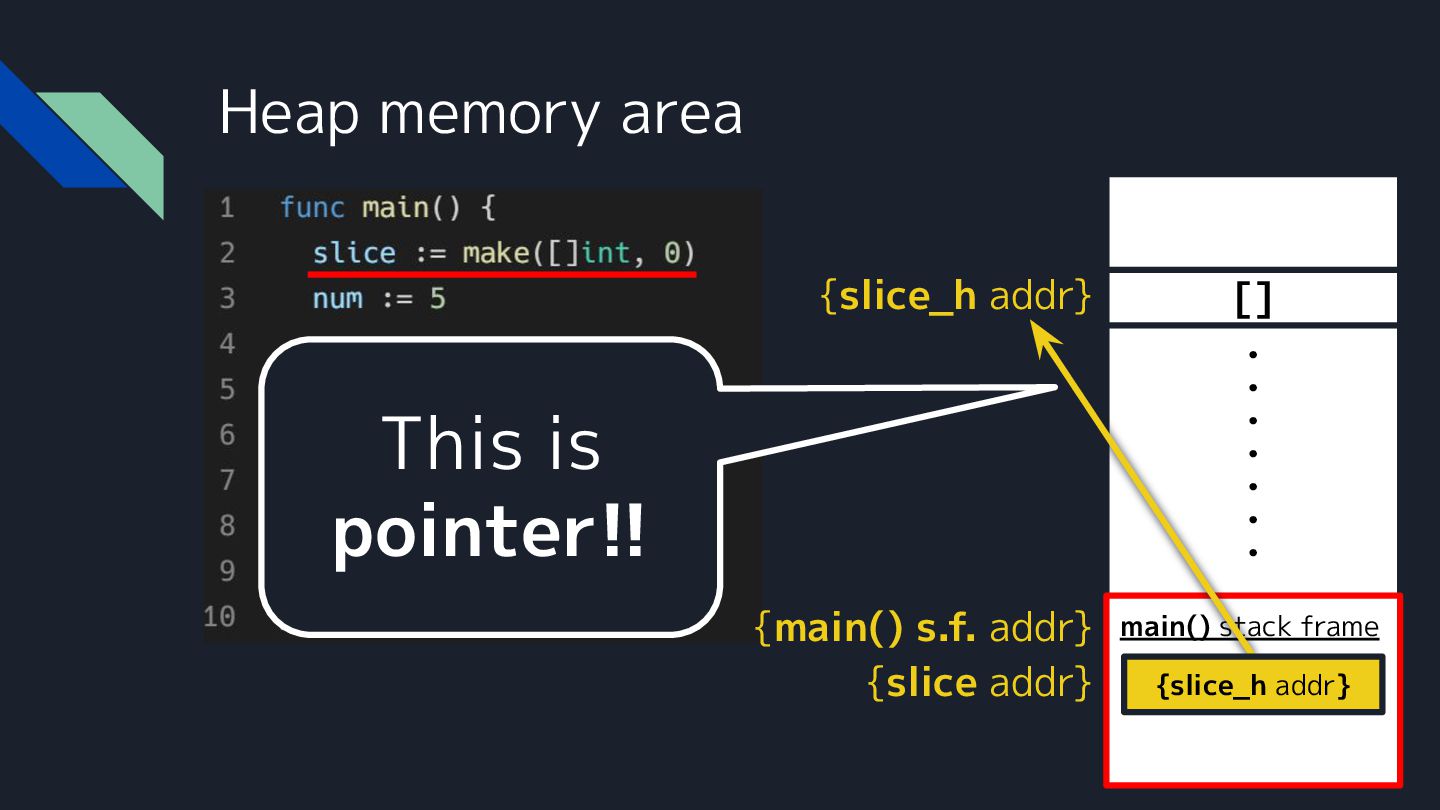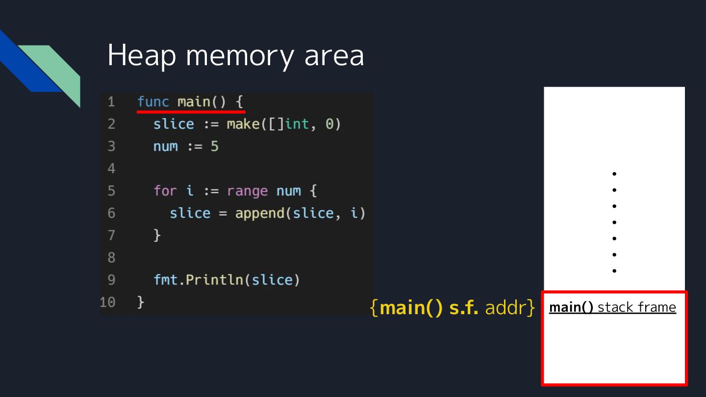 [] {slice_h addr} {main() s.f. addr} main() stack frame Address is determined by runtime