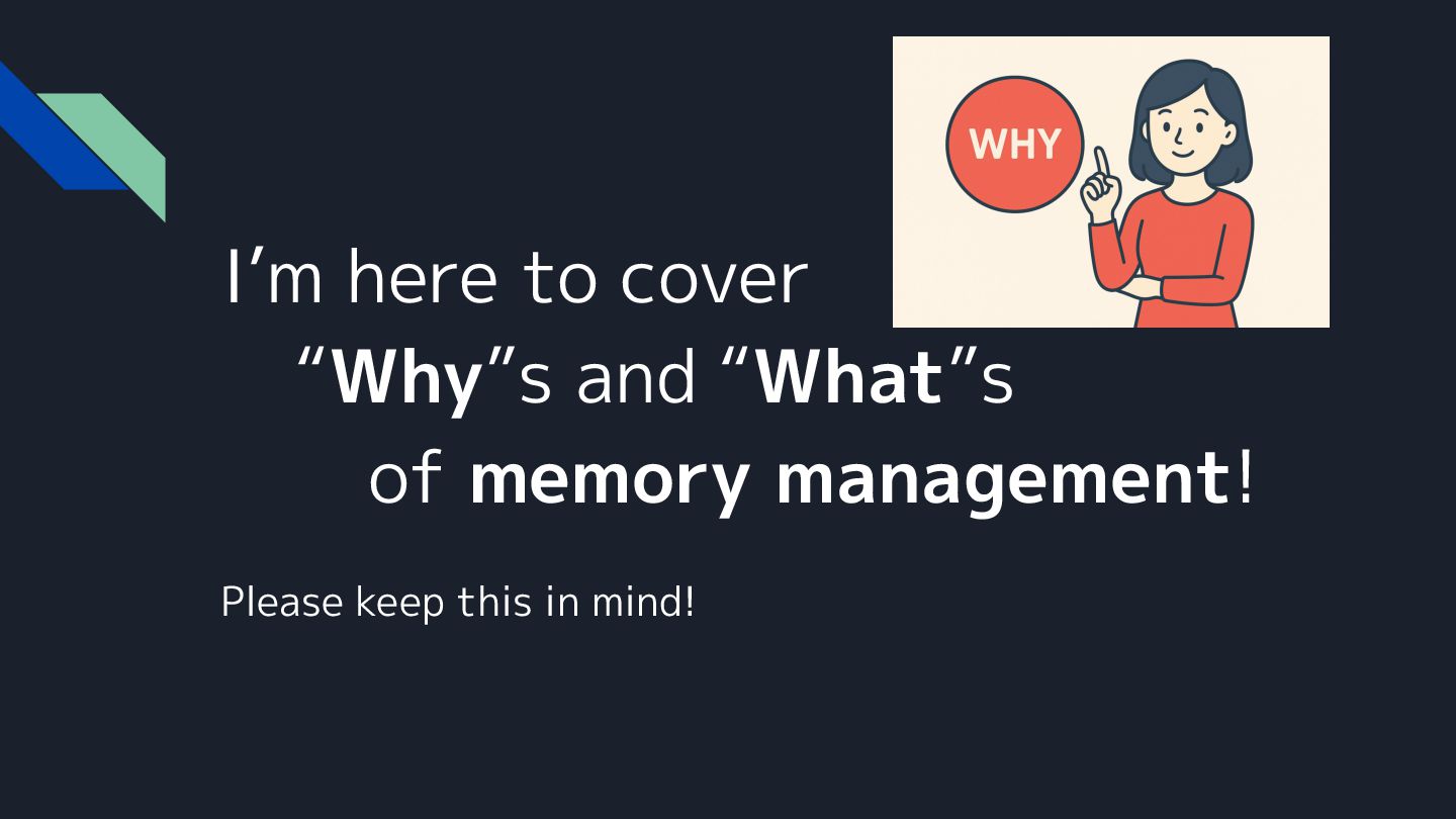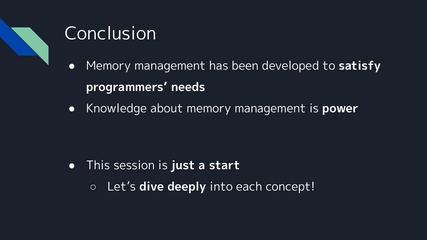 needs • Knowledge about memory management is power • This session is just a start ◦ Let’s dive deeply into each concept!