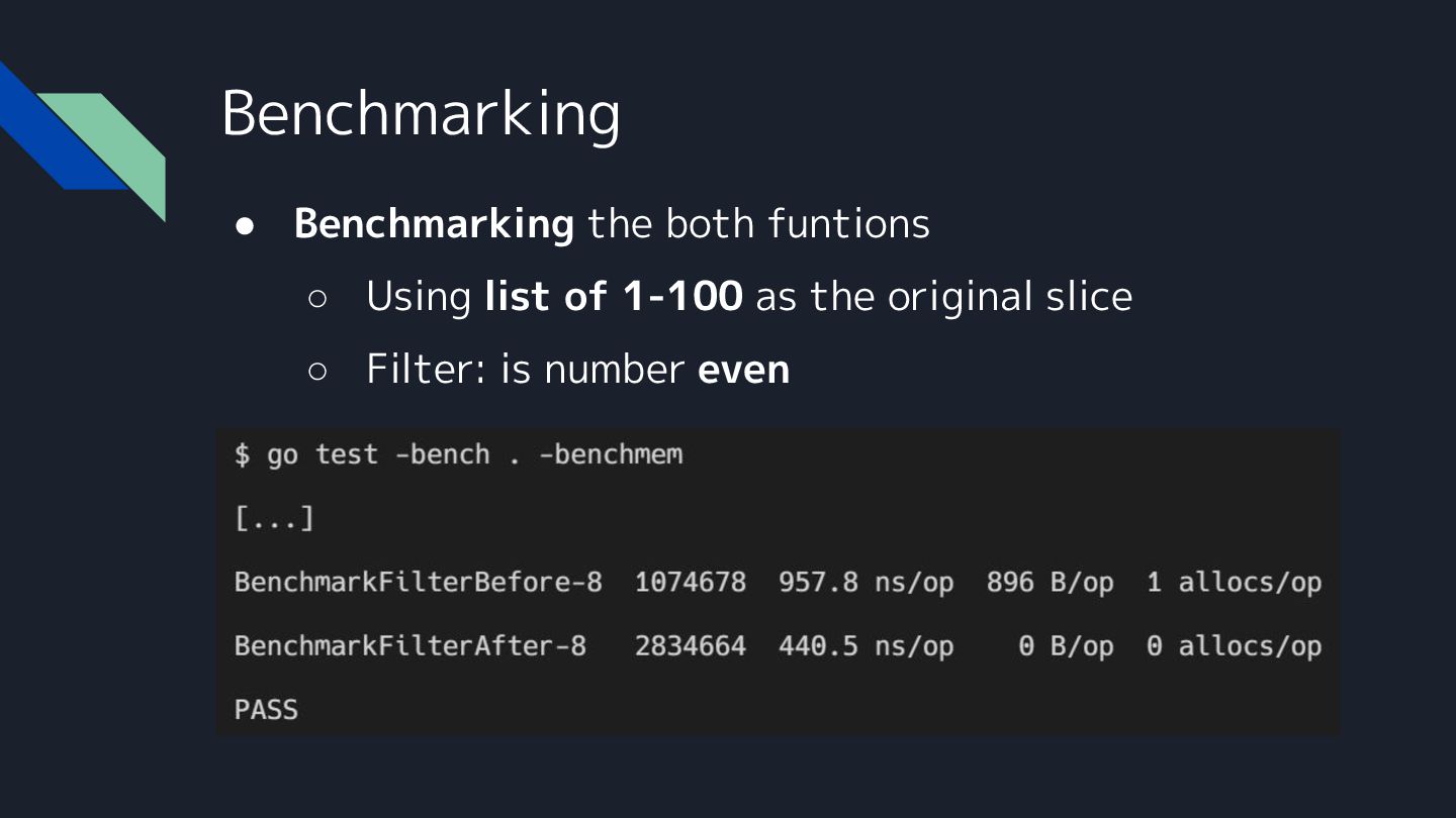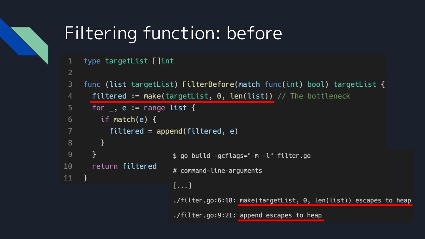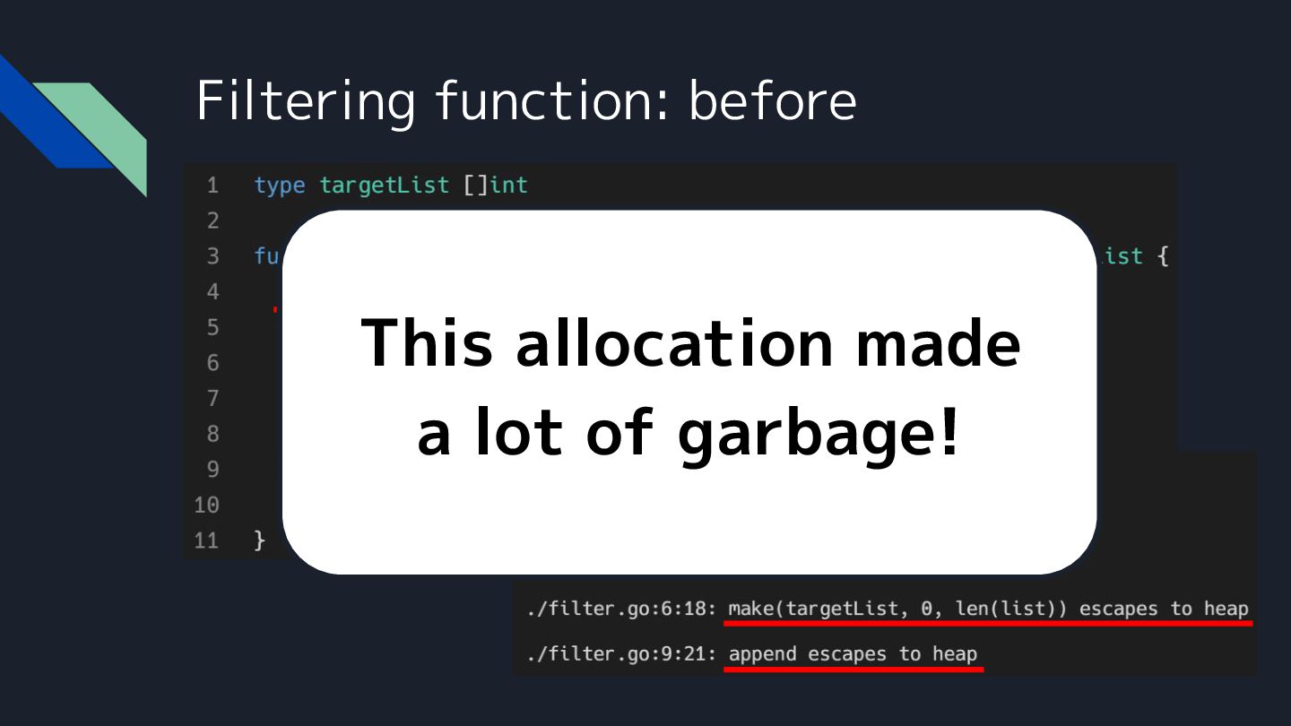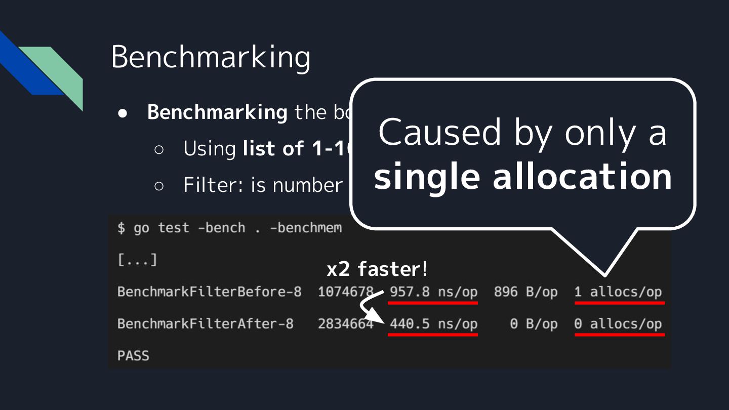 list of 1-100 as the original slice ◦ Filter: is number even Caused by only a single allocation