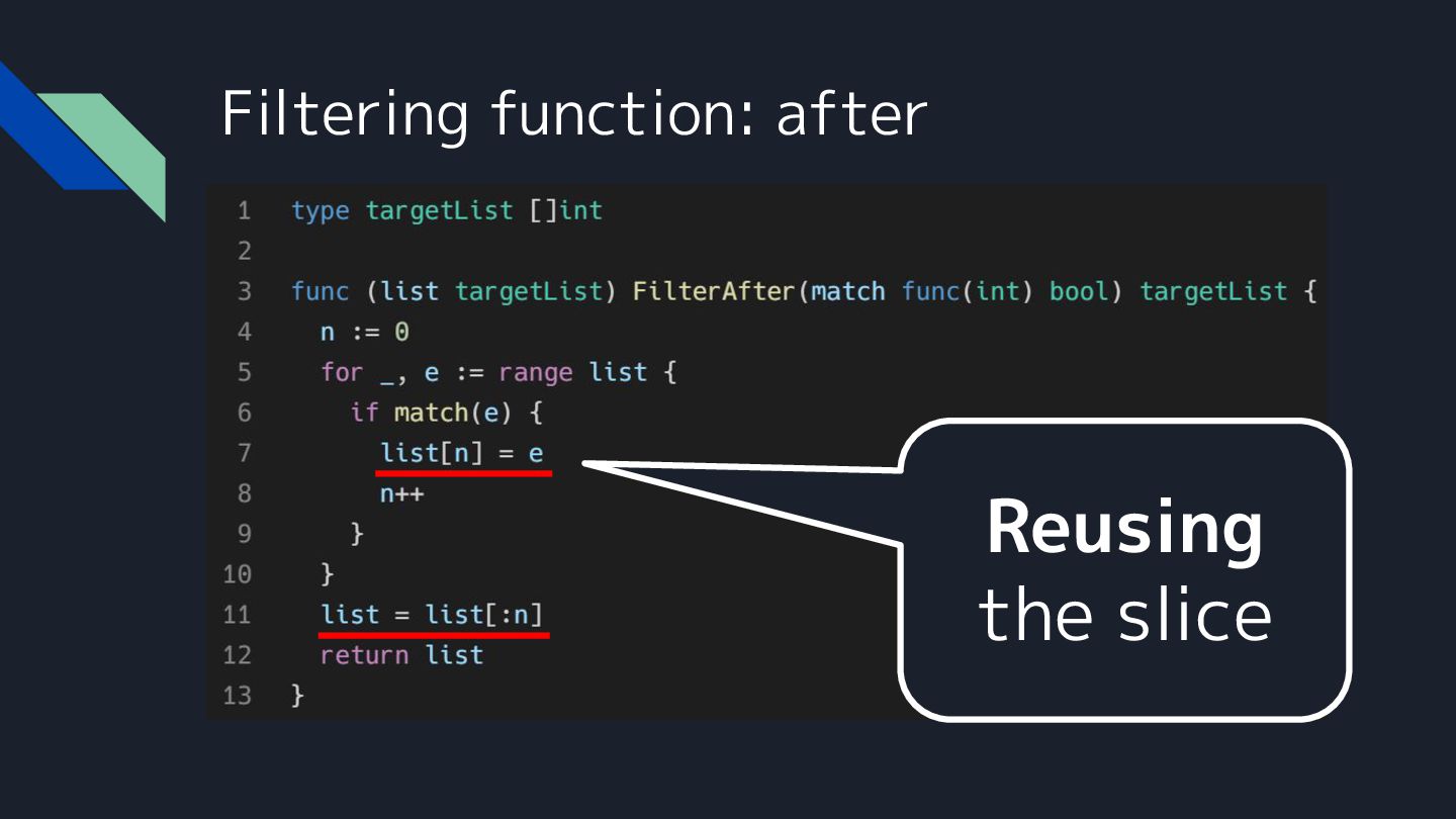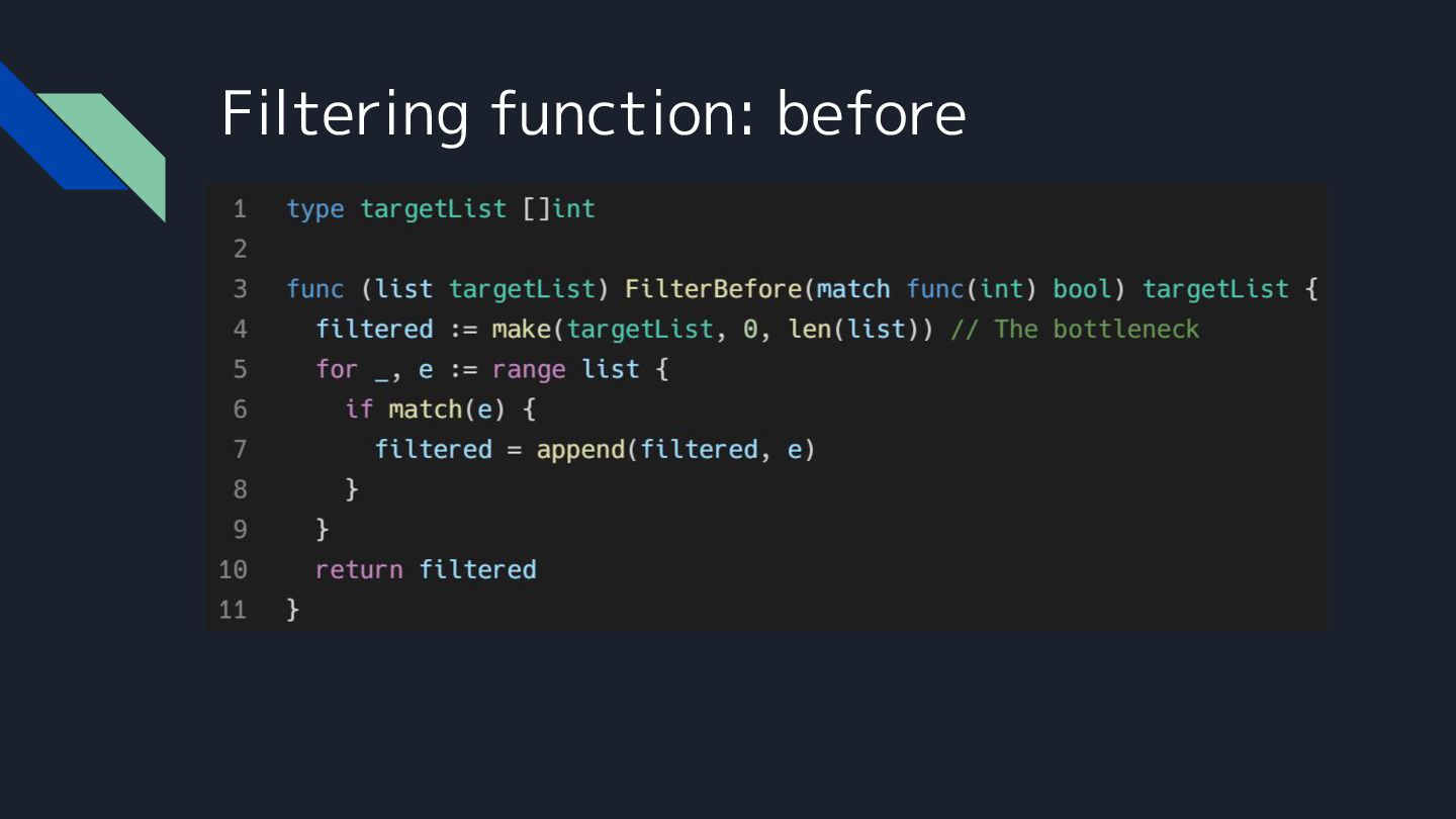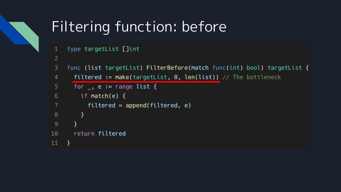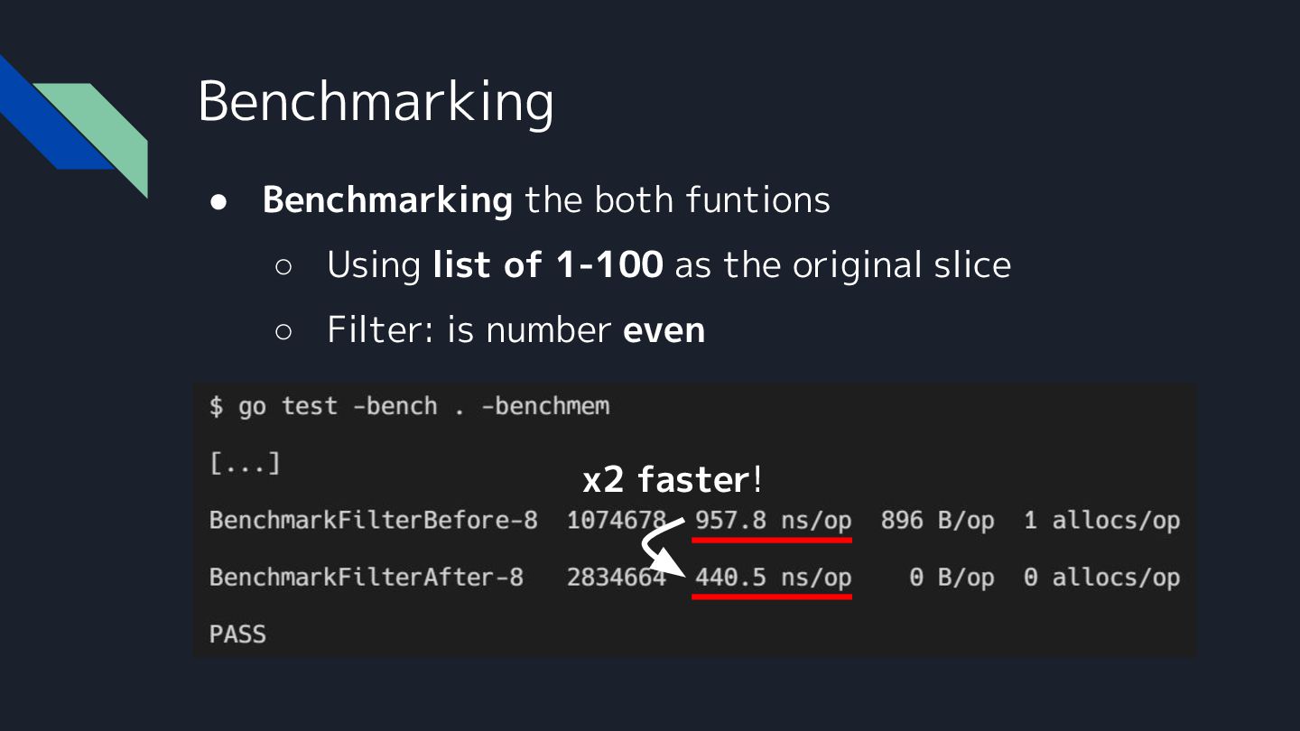 list of 1-100 as the original slice ◦ Filter: is number even Caused by only a single allocation