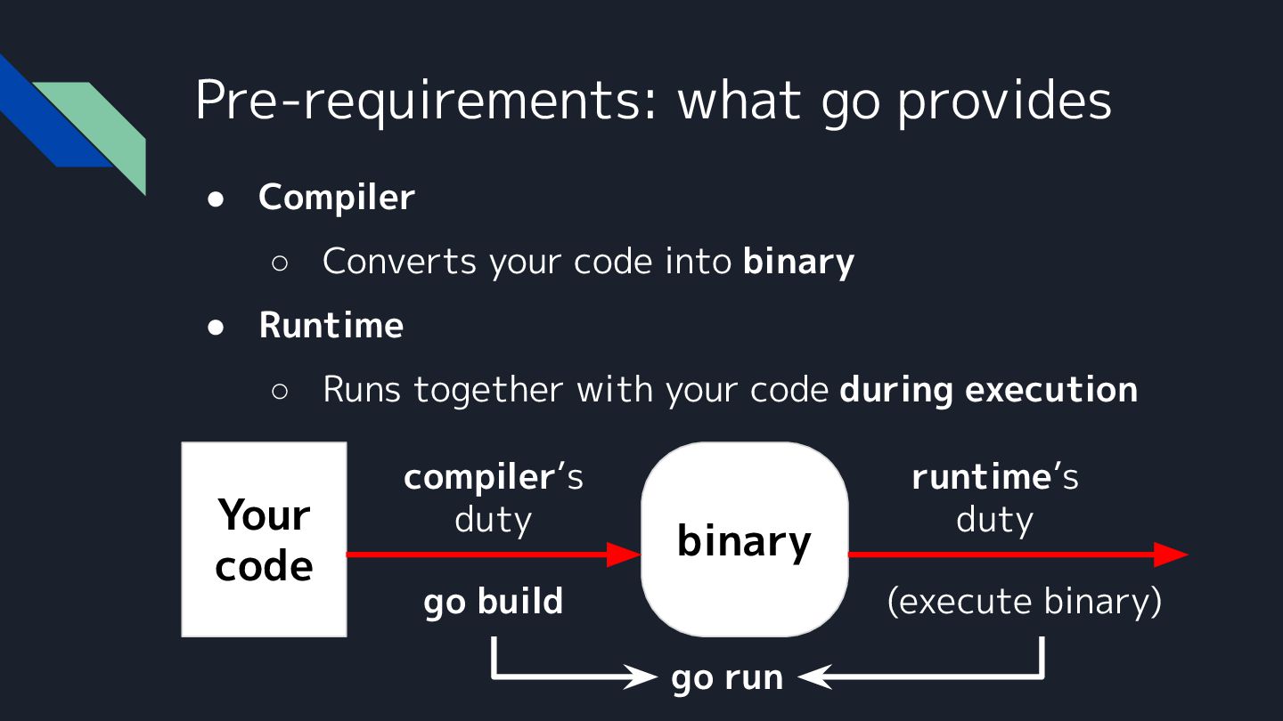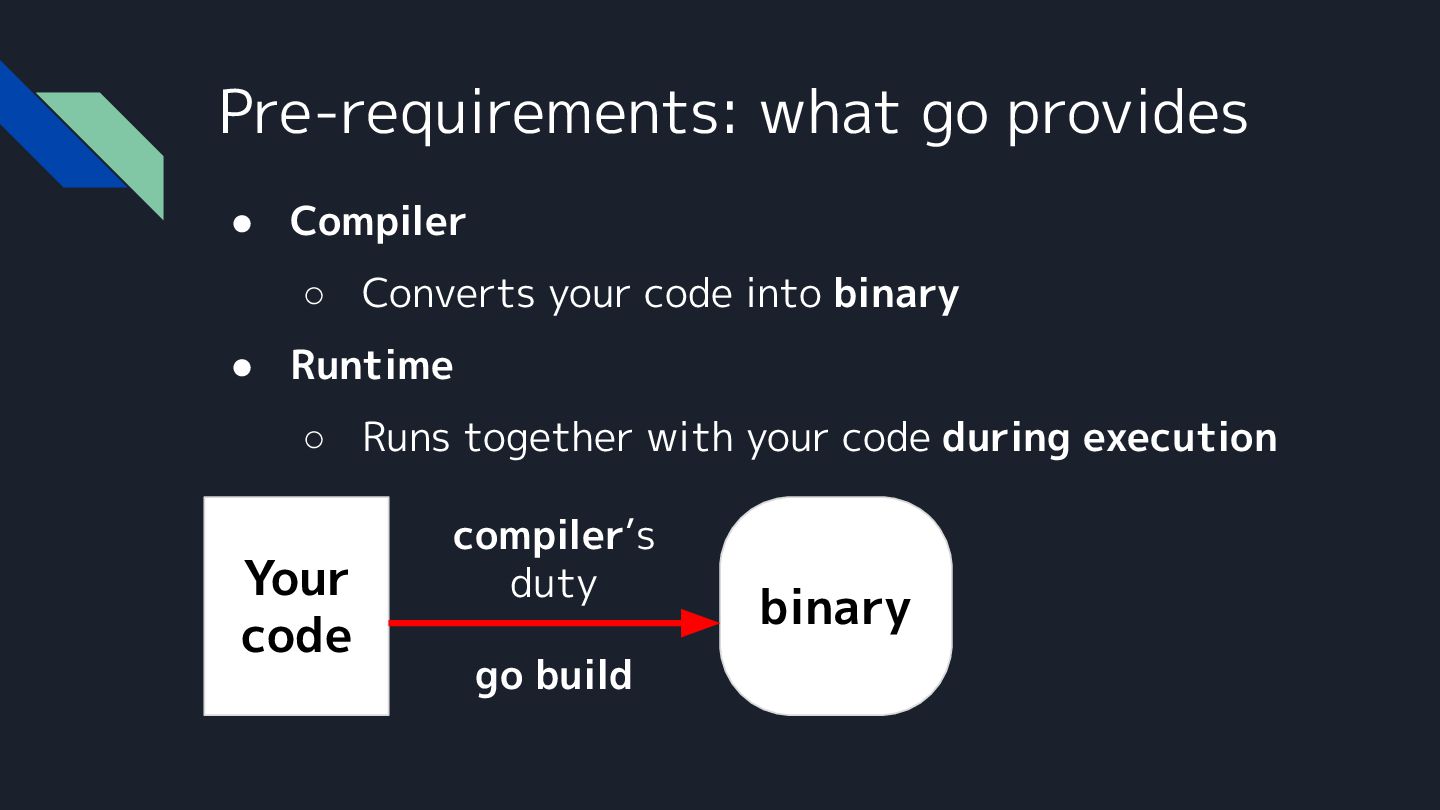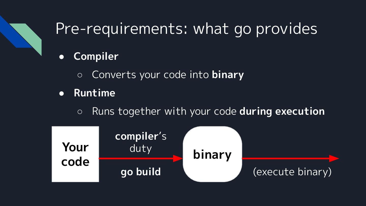 11. Pre-requirements: what go provides Your code binary go build compiler’s