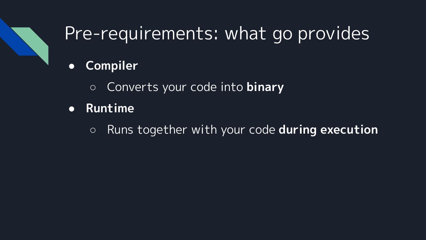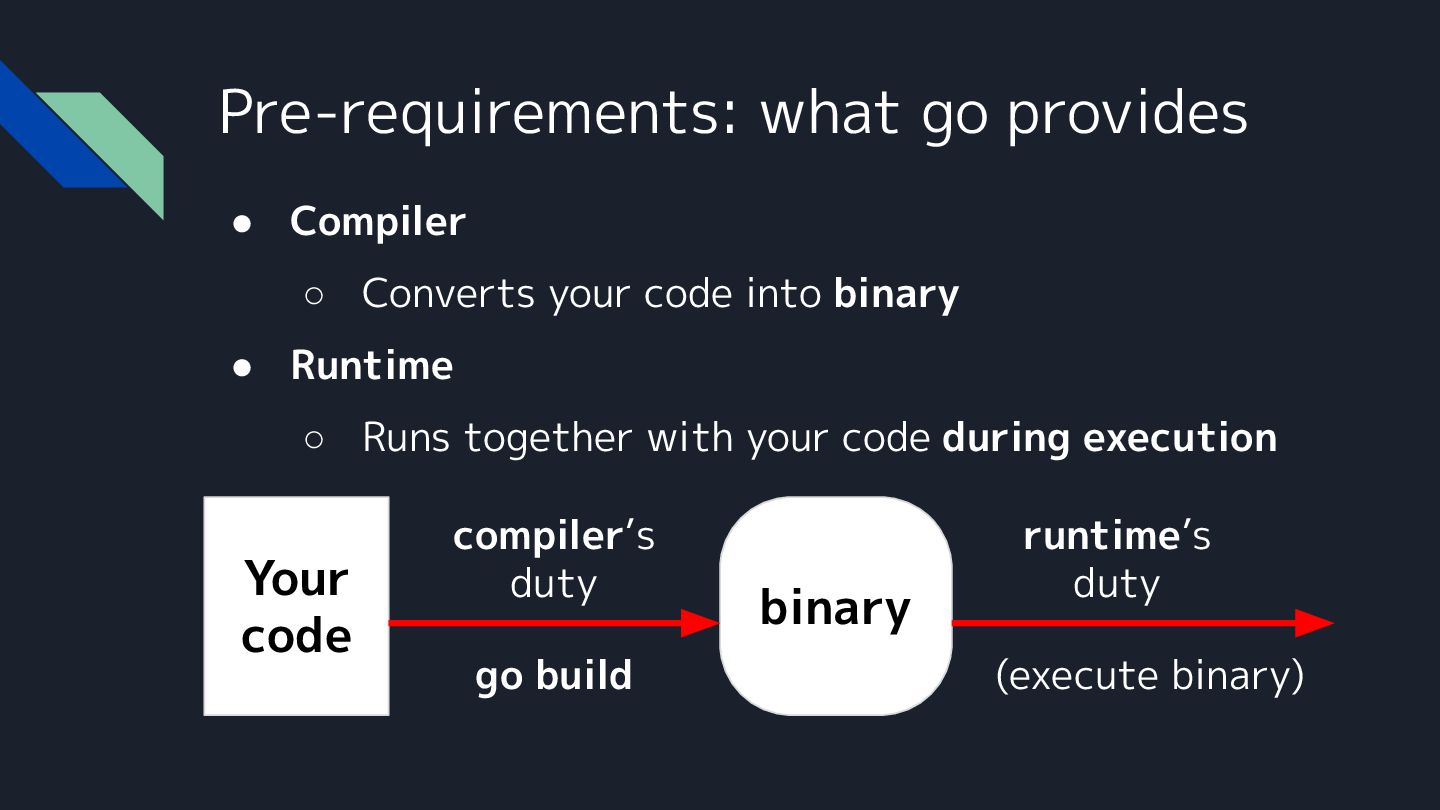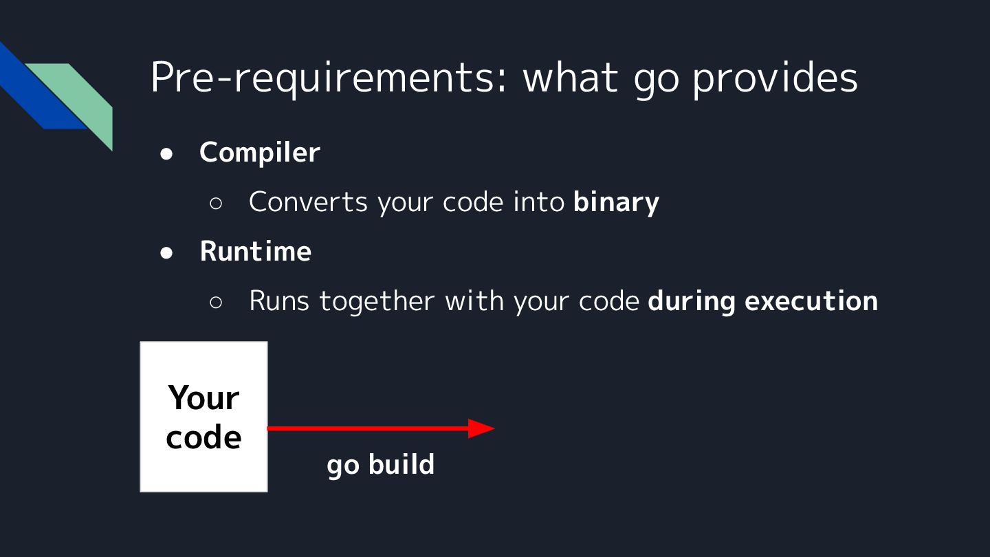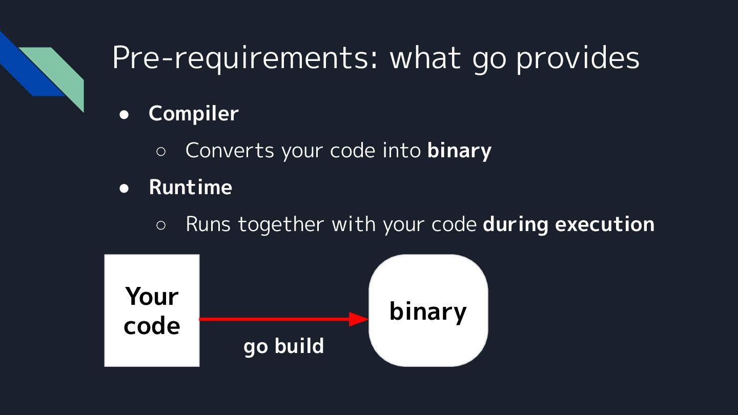 11. Pre-requirements: what go provides Your code binary go build compiler’s