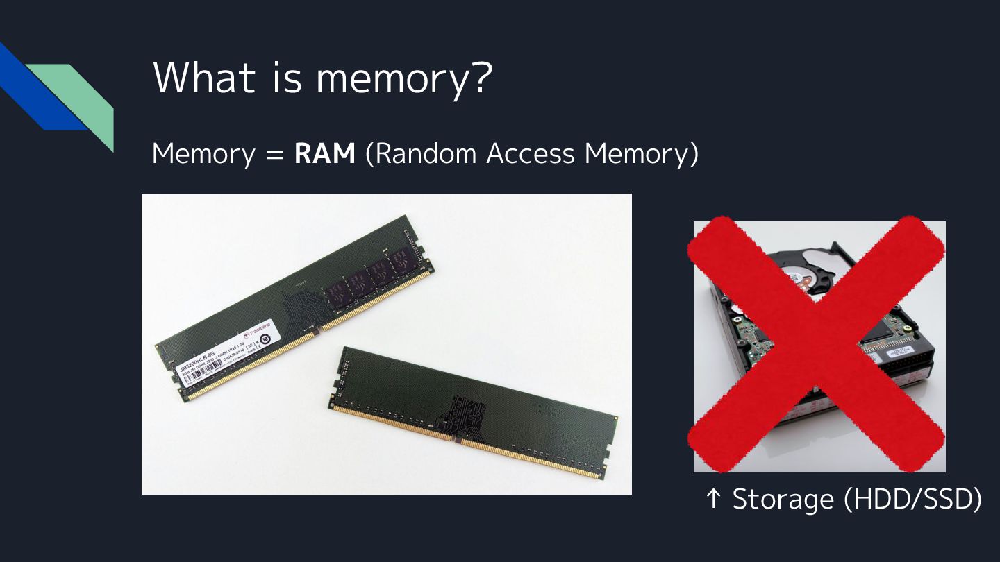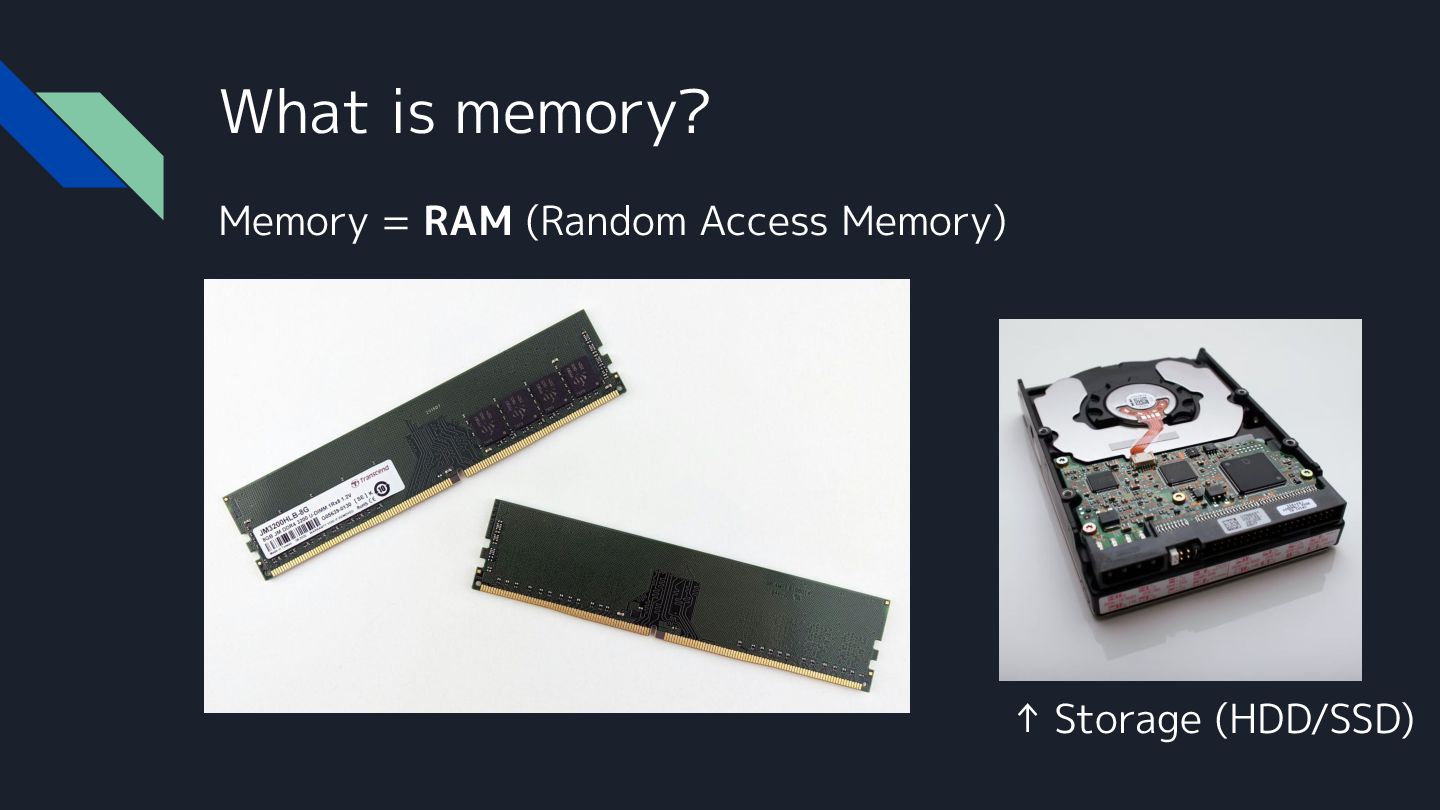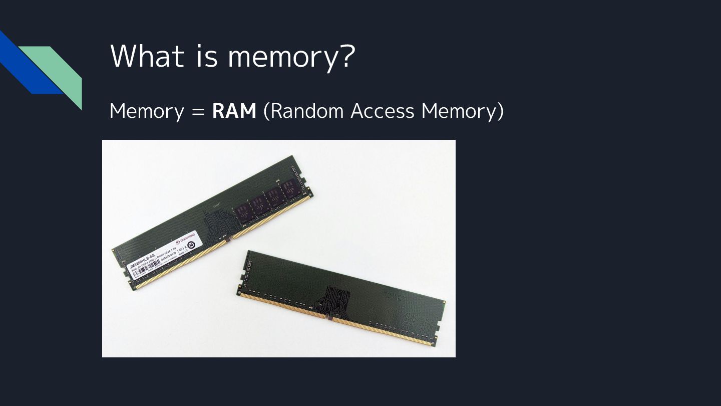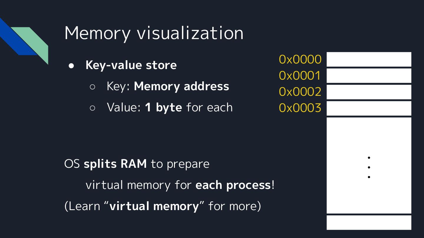 Memory address ◦ Value: 1 byte for each OS splits RAM to prepare virtual memory for each process! (Learn “virtual memory” for more) 0x0000 0x0001 0x0002 0x0003