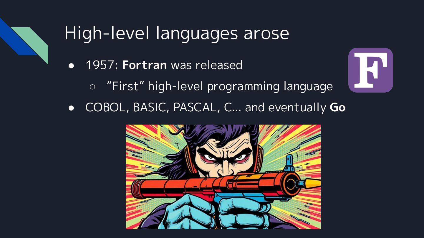 high-level programming language • COBOL, BASIC, PASCAL, C... and eventually Go