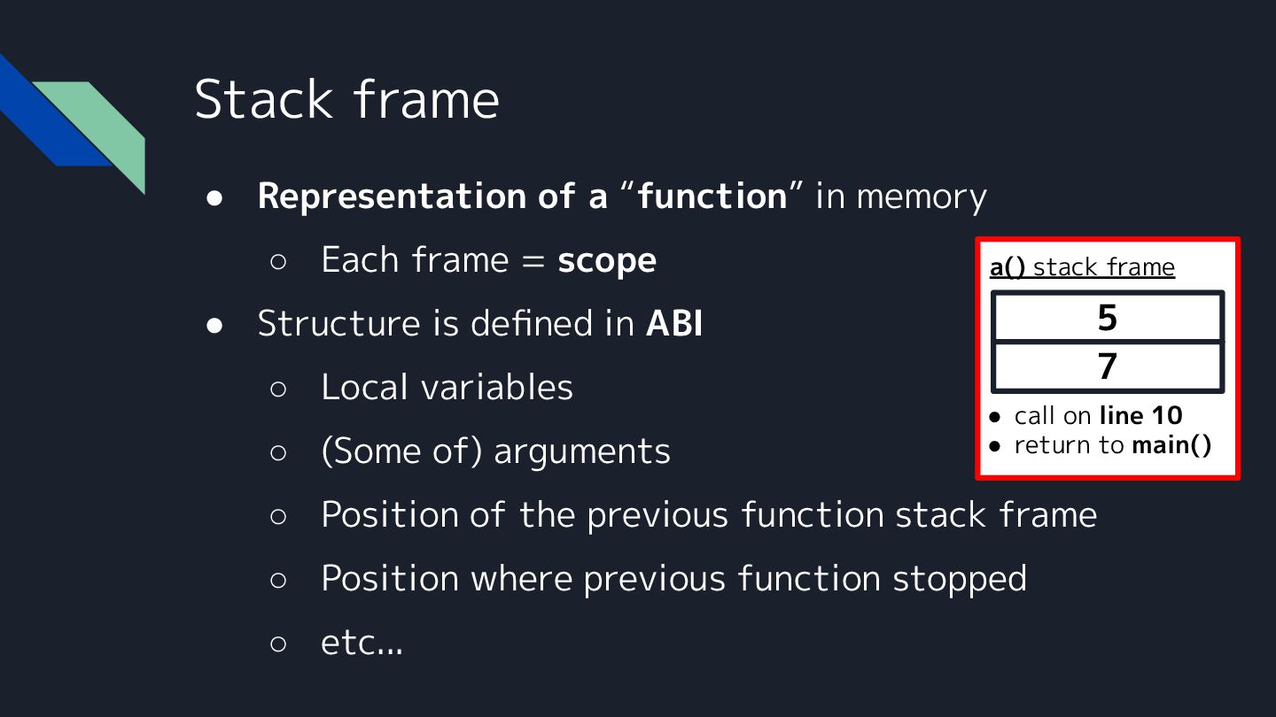 Each frame = scope • Structure is defined in ABI ◦ Local variables ◦ (Some of) arguments ◦ Position of the previous function stack frame ◦ Position where previous function stopped ◦ etc... a() stack frame • call on line 10 • return to main() 5 7
