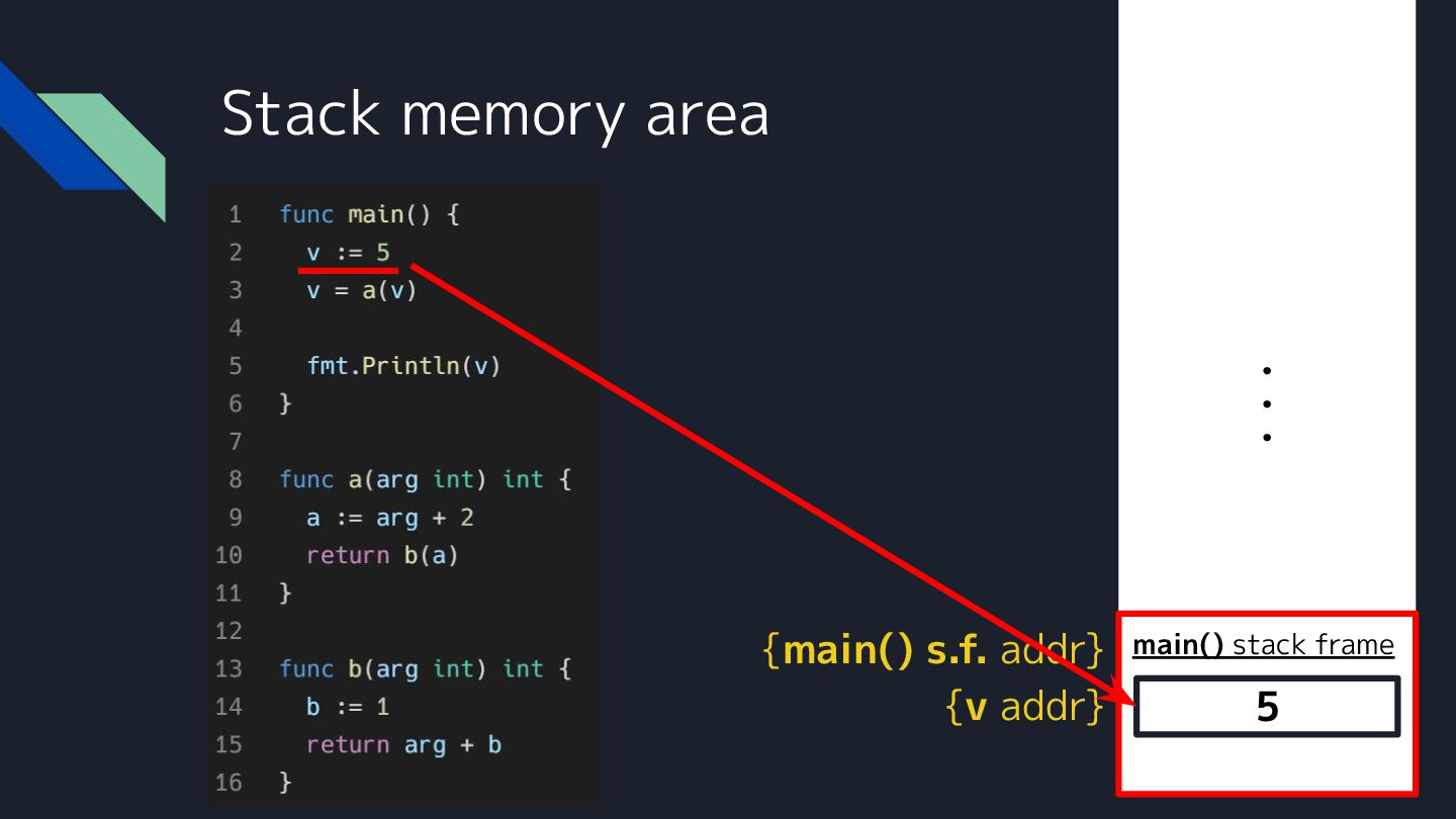 3 5 Stack memory area {main() s.f. addr} {v addr}
