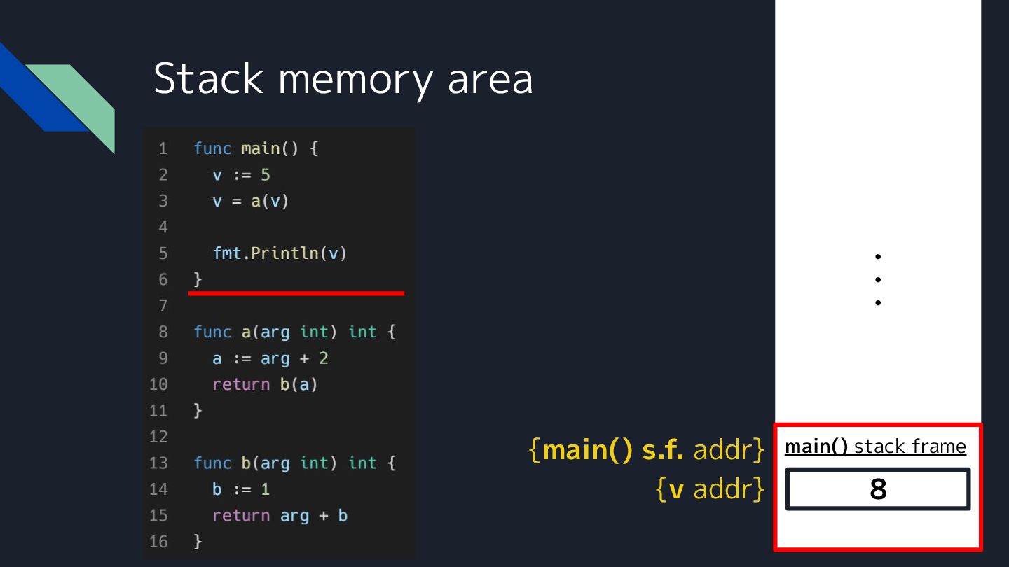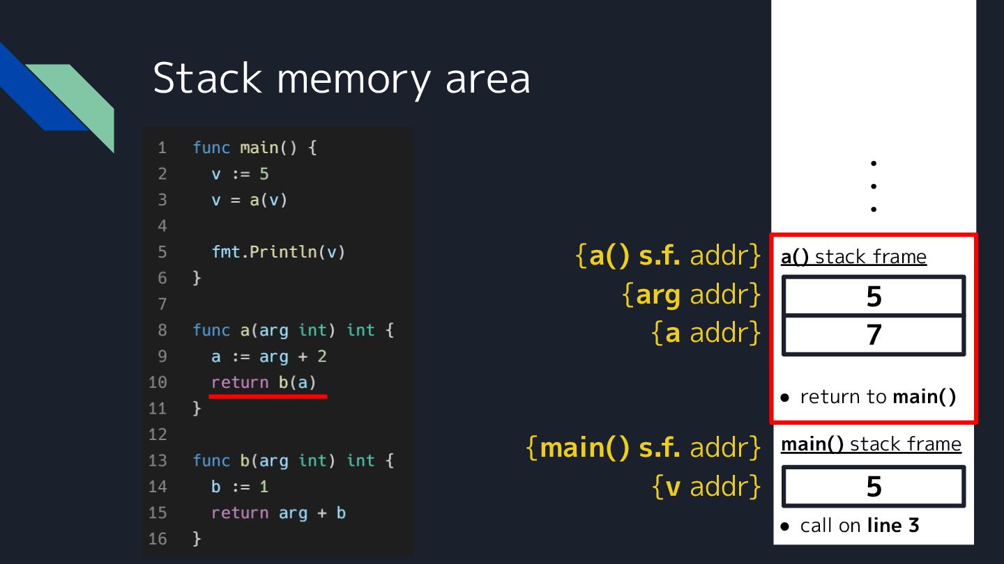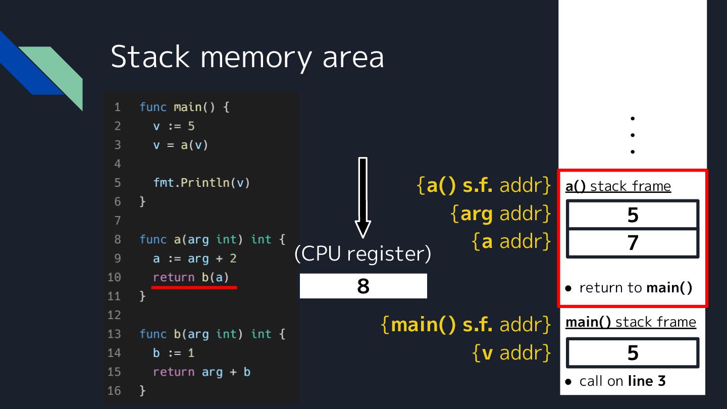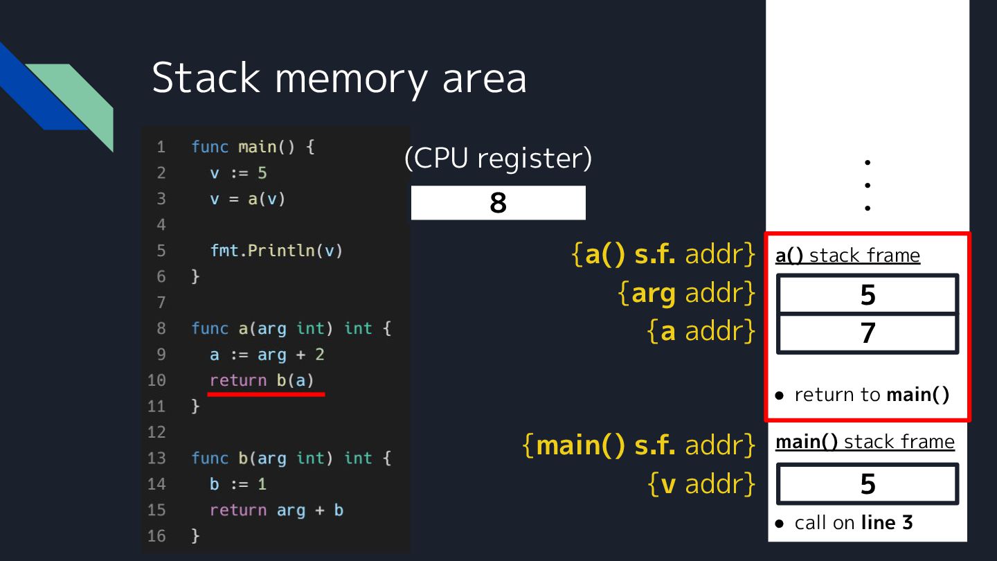 3 5 a() stack frame • call on line 10 • return to main() 5 7 Stack memory area {a() s.f. addr} {arg addr} {a addr} {main() s.f. addr} {v addr}