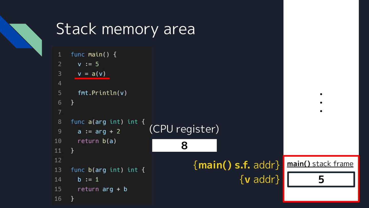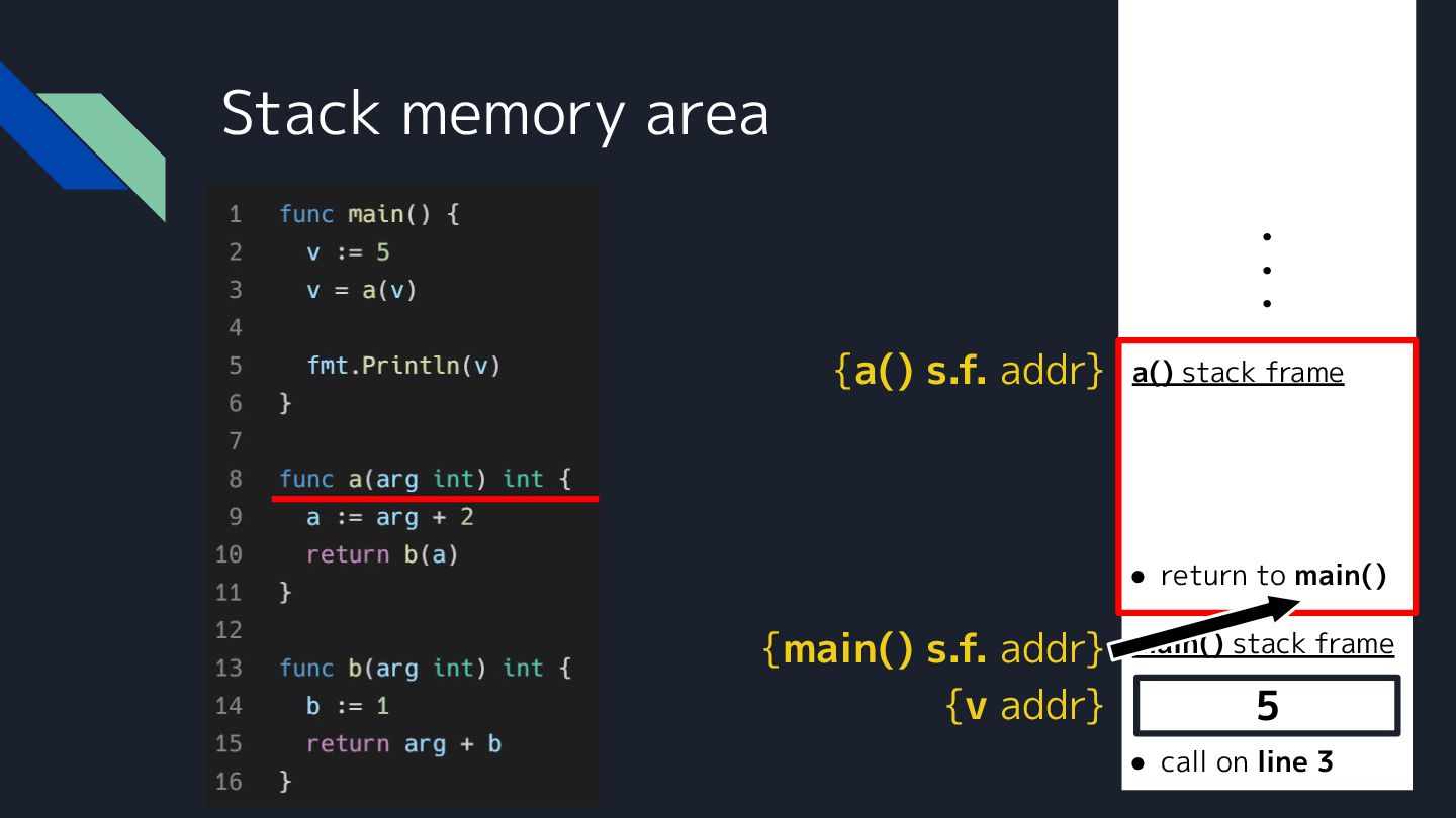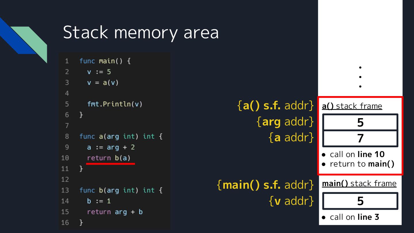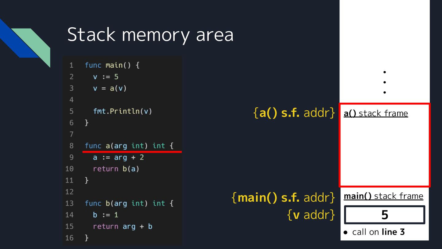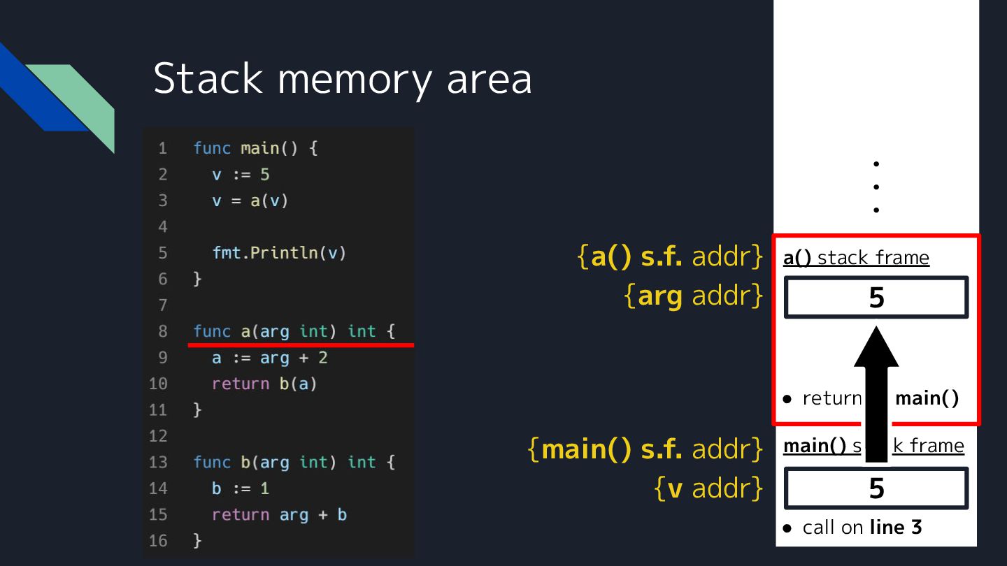 3 5 a() stack frame • call on line 10 • return to main() 5 7 Stack memory area {a() s.f. addr} {arg addr} {a addr} {main() s.f. addr} {v addr}