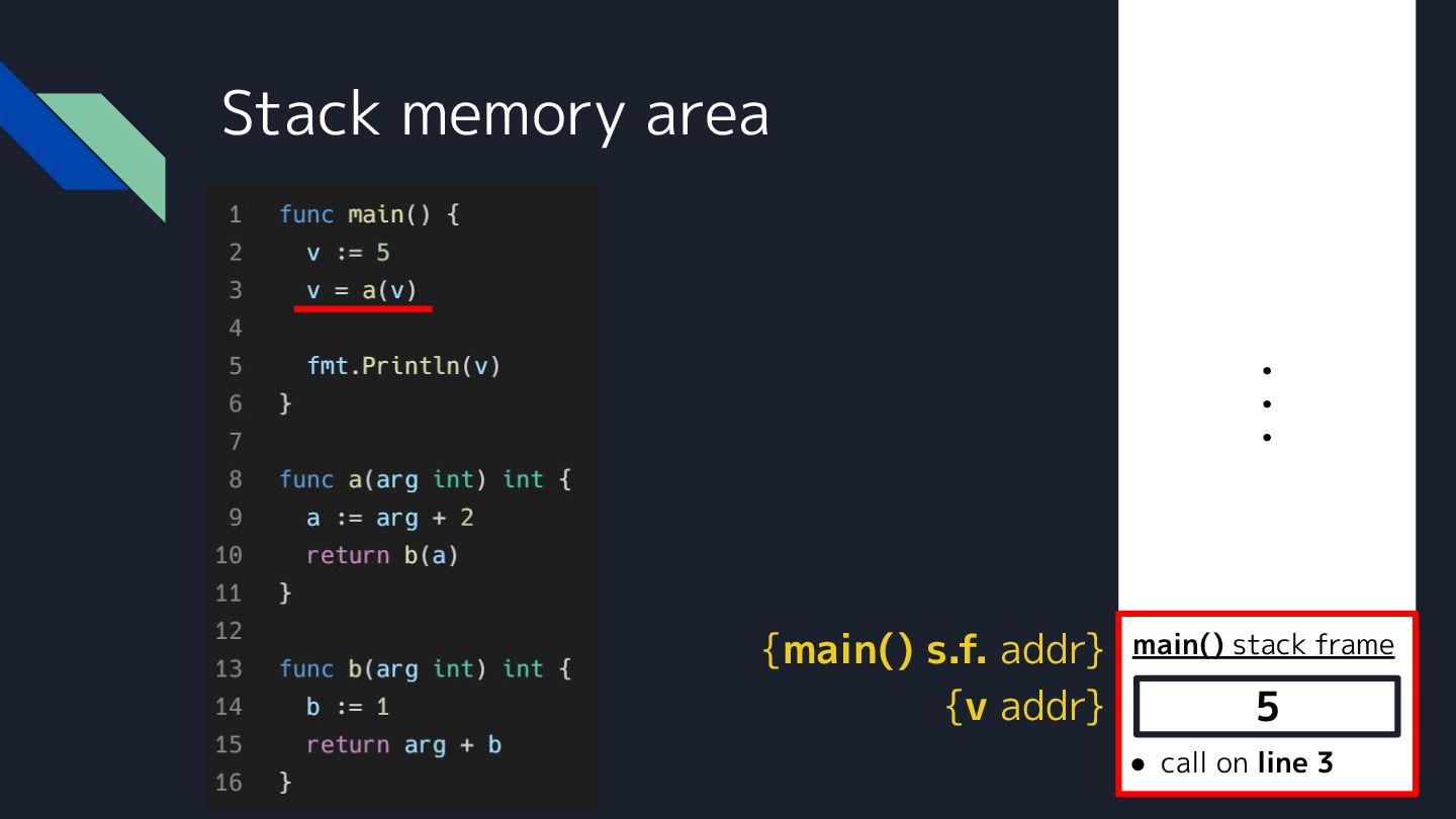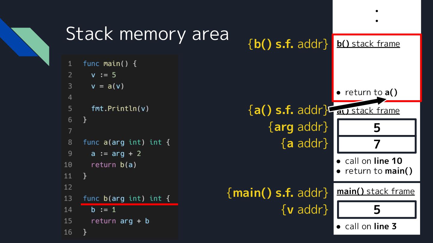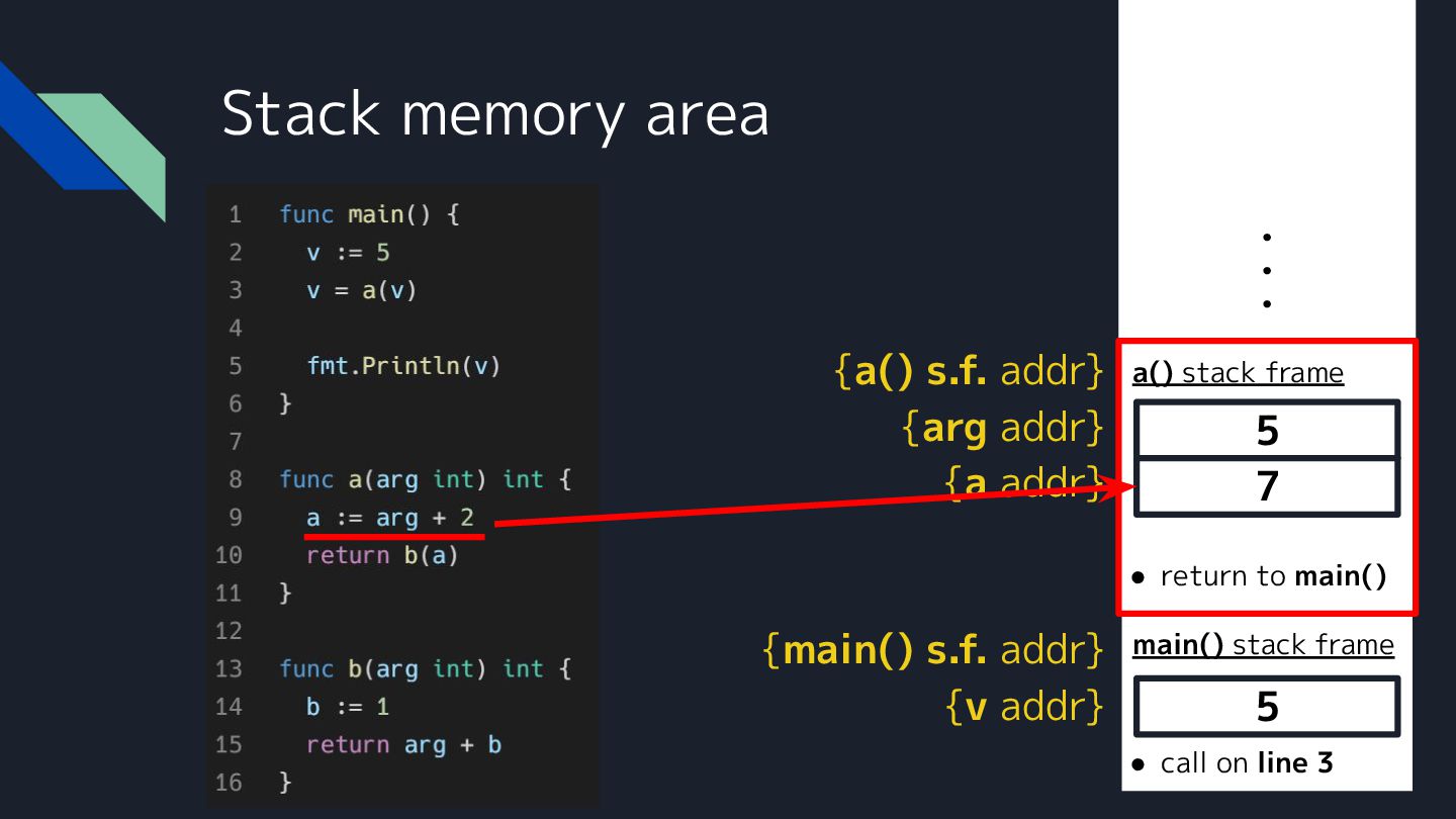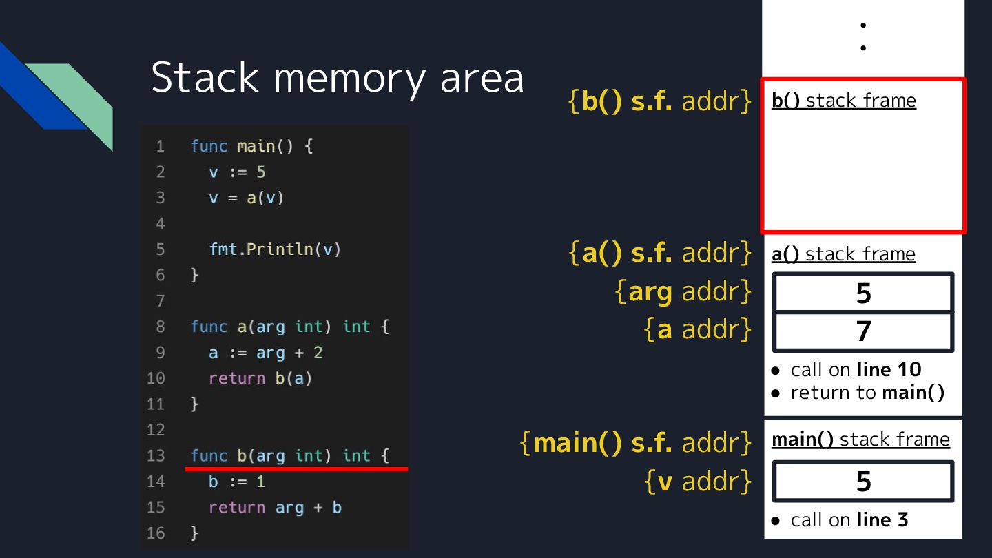 3 5 a() stack frame • call on line 10 • return to main() 5 7 Stack memory area {a() s.f. addr} {arg addr} {a addr} {main() s.f. addr} {v addr}