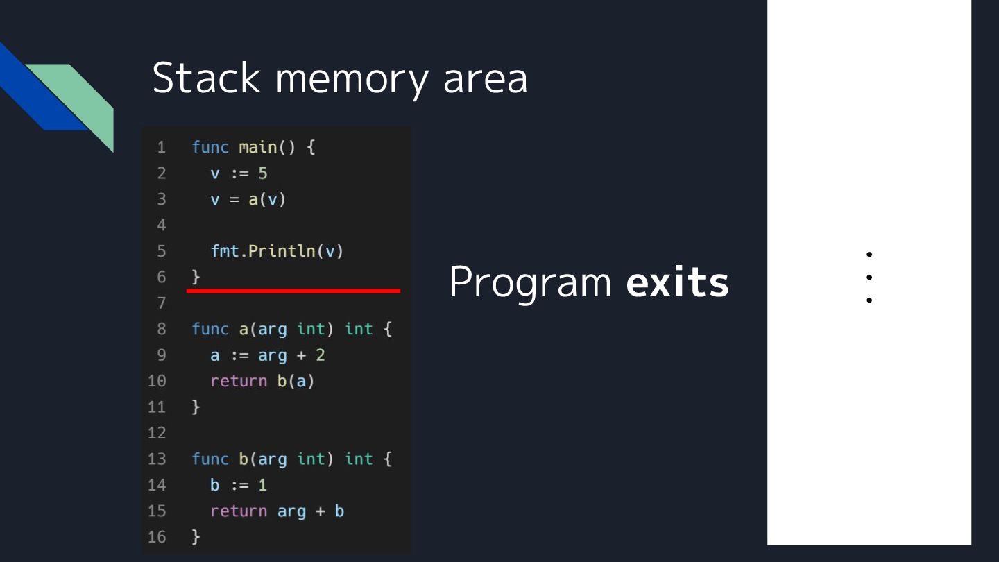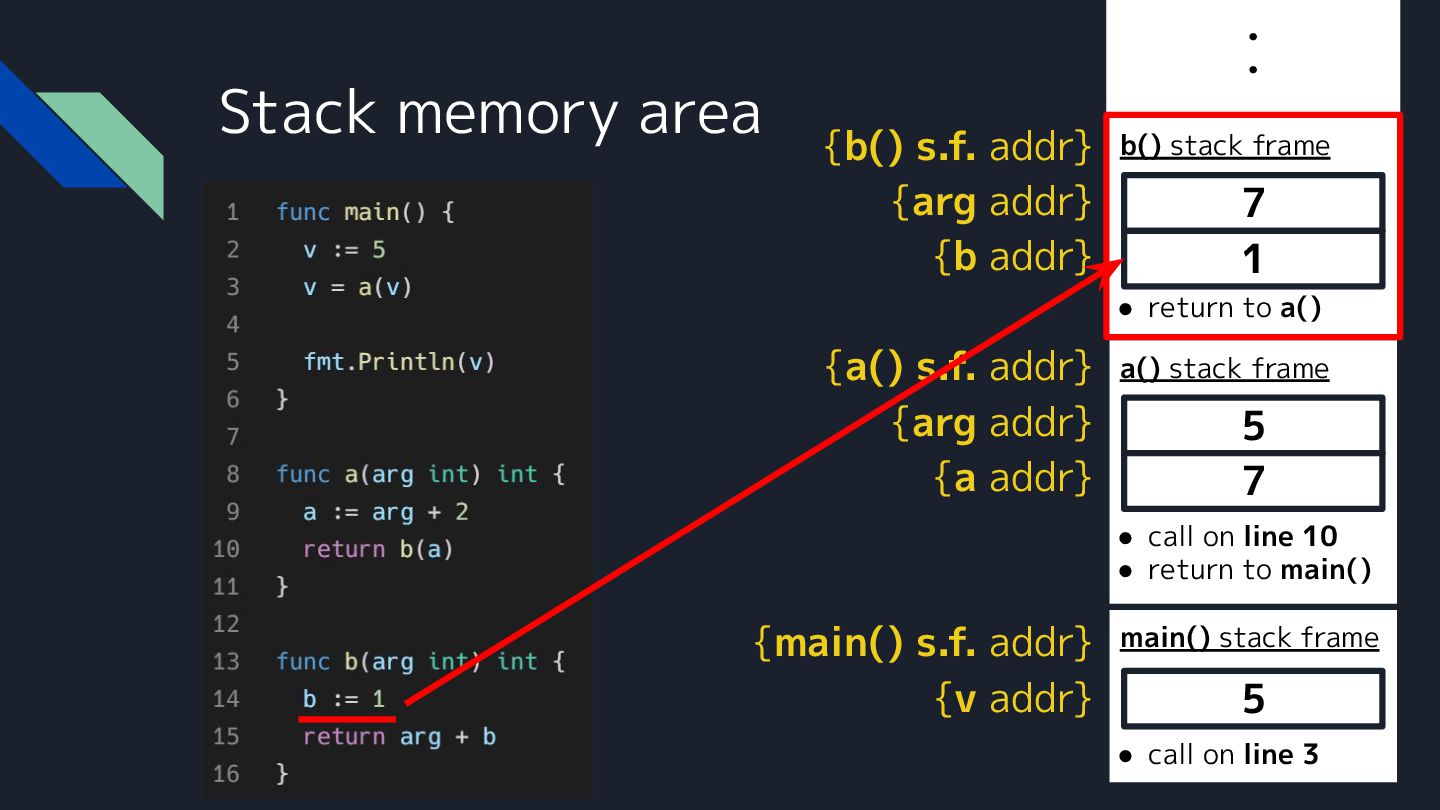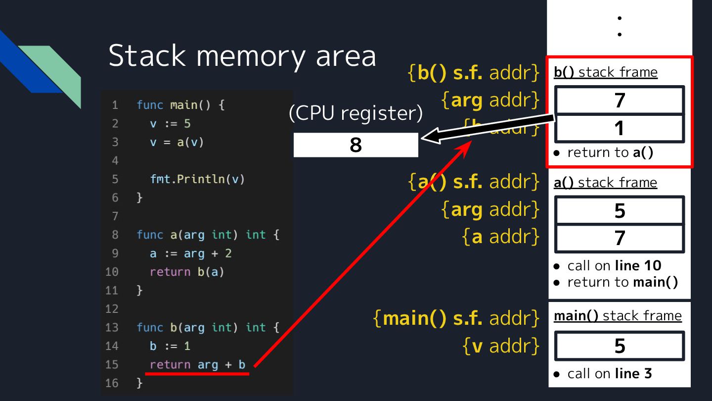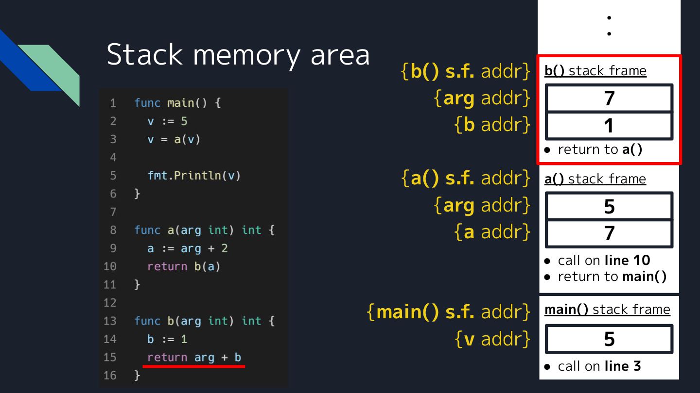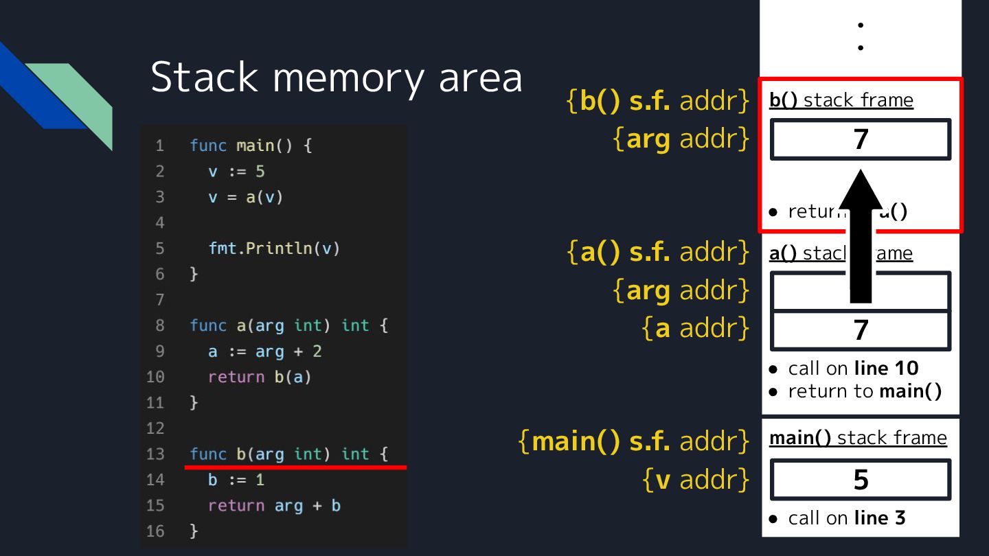3 5 a() stack frame • call on line 10 • return to main() 5 7 Stack memory area {a() s.f. addr} {arg addr} {a addr} {main() s.f. addr} {v addr}