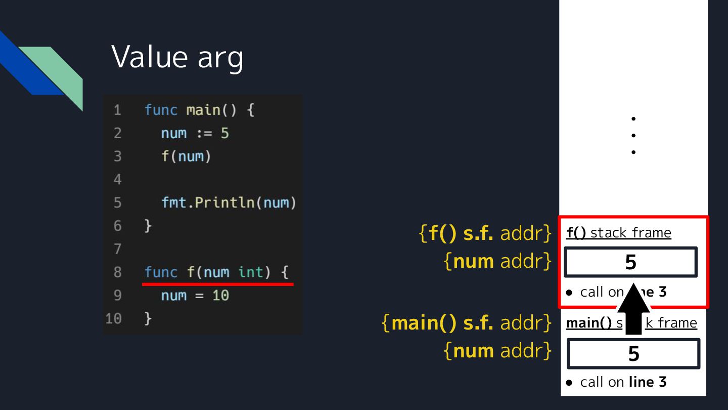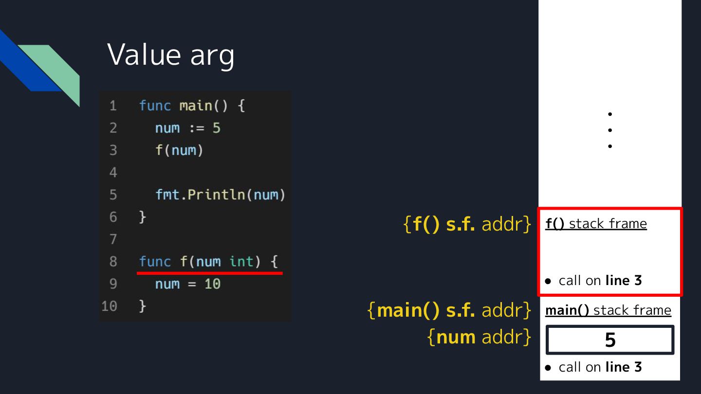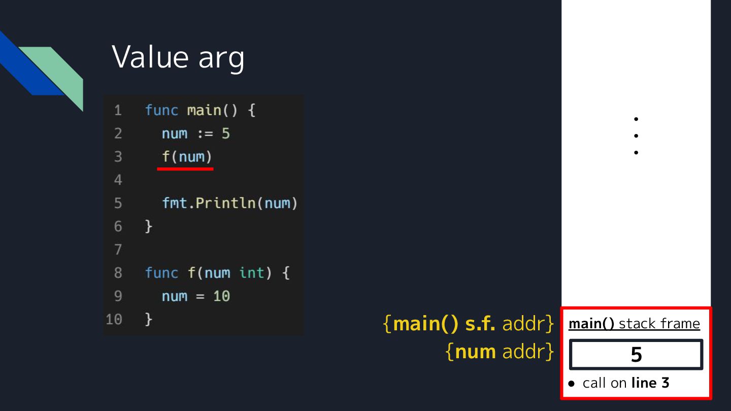 . . . main() stack frame • call on line 3 5 Value arg f() stack frame • call on line 3 10 Doesn’t affect to num in main() func!