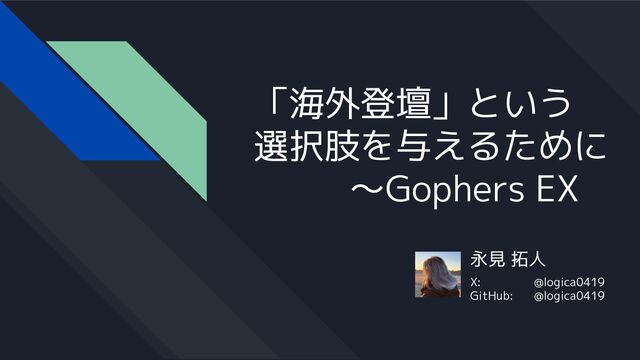 永見 拓人 X: @logica0419 GitHub: @logica0419 「海外登壇」という 選択肢を与えるために 〜Gophers EX