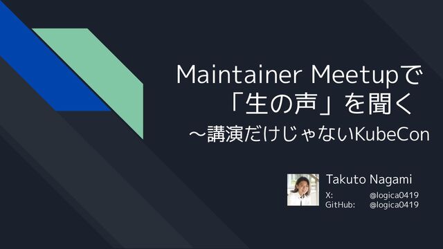 Takuto Nagami X: @logica0419 GitHub: @logica0419 Maintainer Meetupで 「生の声」を聞く ~講演だけじゃないKubeCon