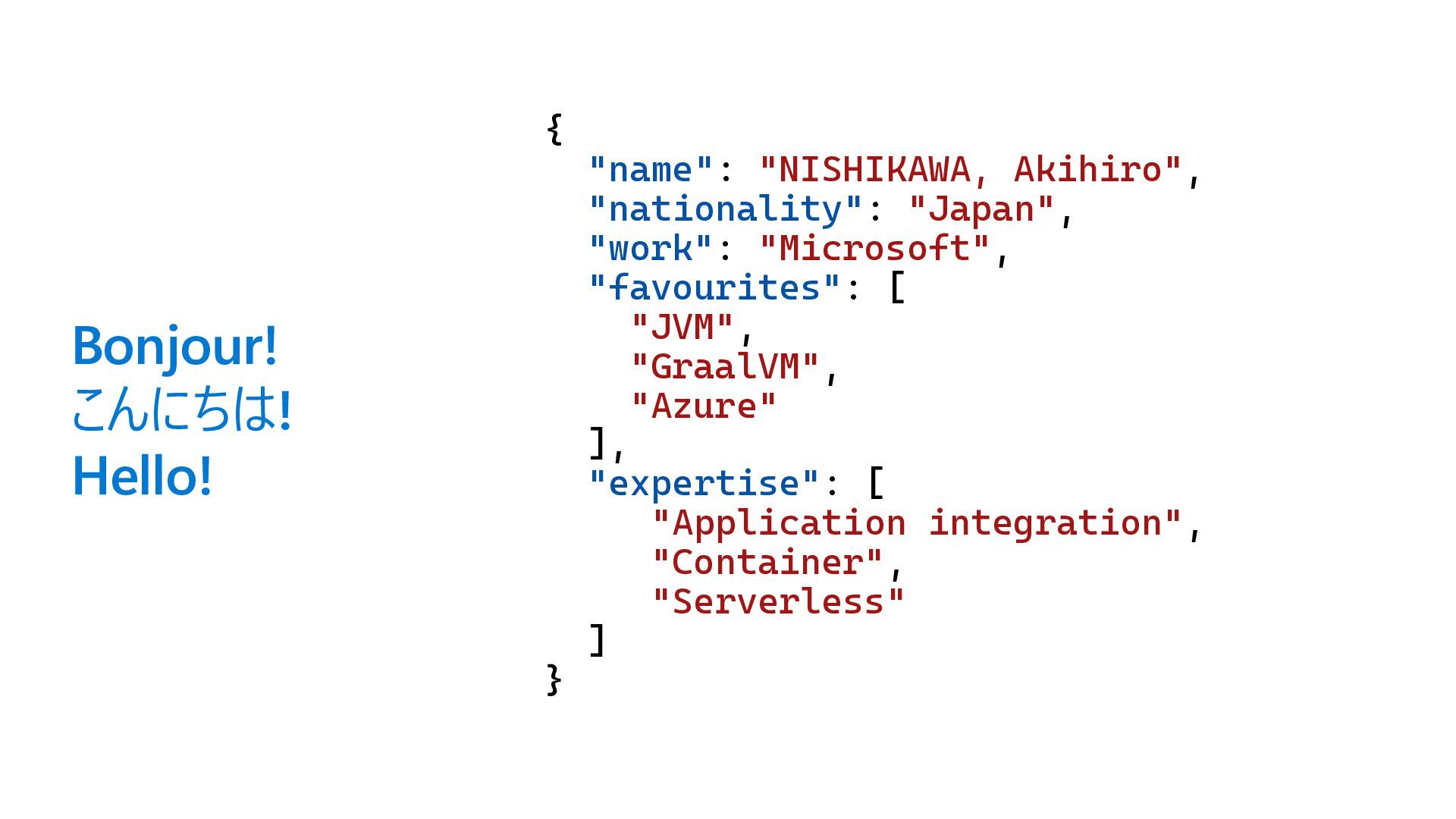 "Microsoft", "favourites": [ "JVM", "GraalVM", "Azure" ], "expertise": [ "Application integration", "Container", "Serverless" ] }