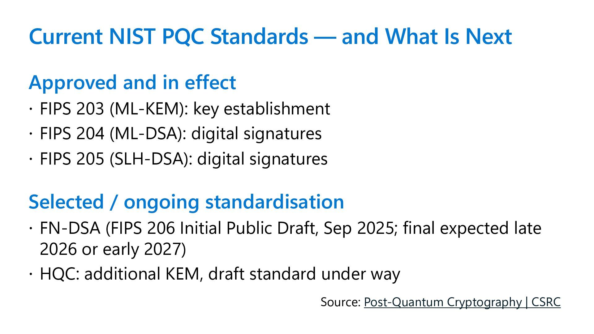 Post-Quantum Cryptography | CSRC Approved and in effect ž FIPS 203 (ML-KEM): key establishment ž FIPS 204 (ML-DSA): digital signatures ž FIPS 205 (SLH-DSA): digital signatures Selected / ongoing standardisation ž FN-DSA (FIPS 206 Initial Public Draft, Sep 2025; final expected late 2026 or early 2027) ž HQC: additional KEM, draft standard under way