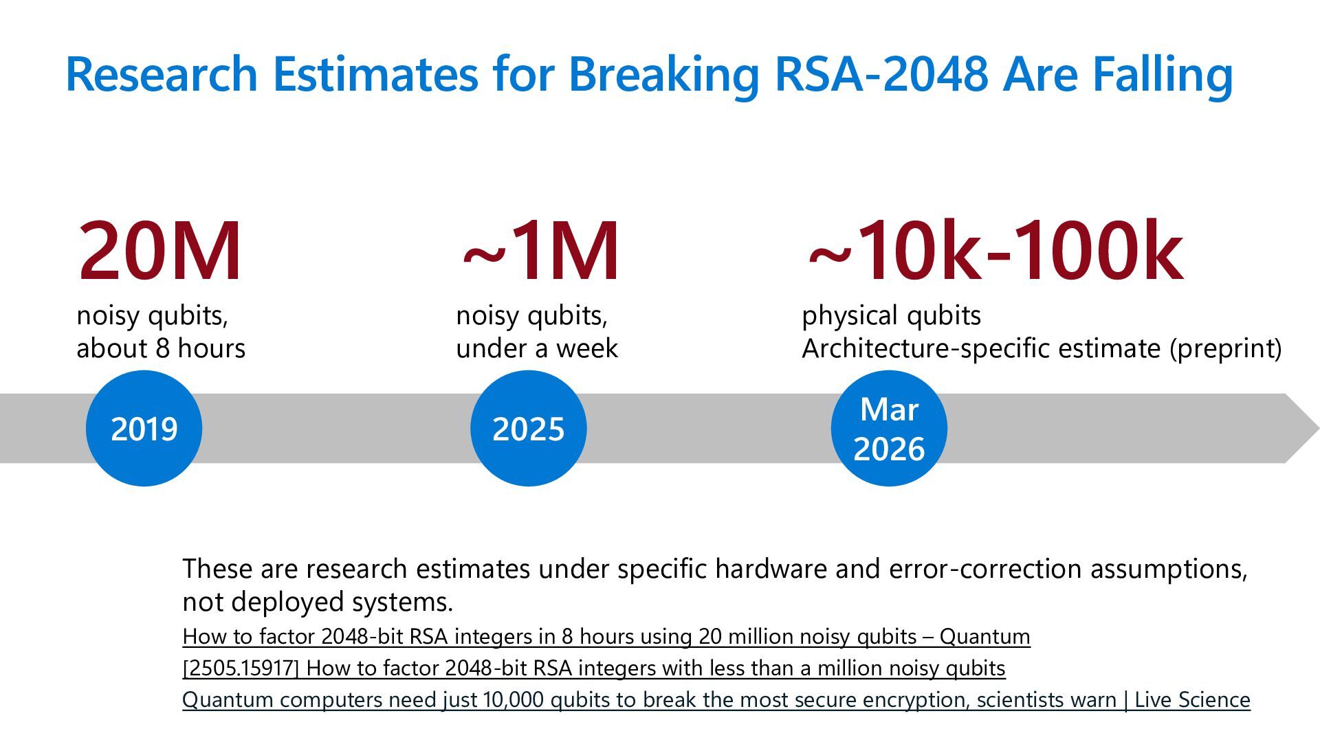 estimates under specific hardware and error-correction assumptions, not deployed systems. How to factor 2048-bit RSA integers in 8 hours using 20 million noisy qubits – Quantum [2505.15917] How to factor 2048-bit RSA integers with less than a million noisy qubits Quantum computers need just 10,000 qubits to break the most secure encryption, scientists warn | Live Science 2025 2019 Mar 2026 20M noisy qubits, about 8 hours ~1M noisy qubits, under a week ~10k-100k physical qubits Architecture-specific estimate (preprint)