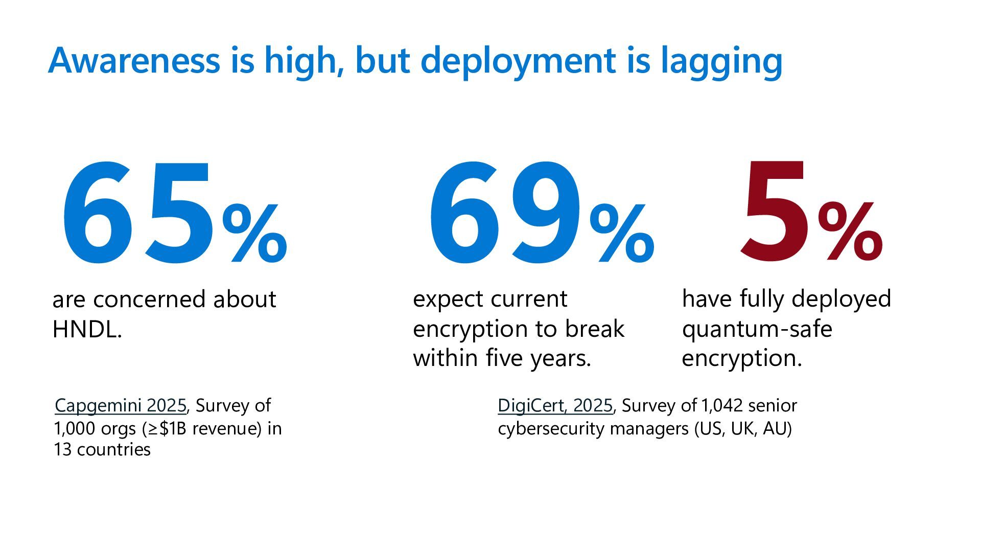 concerned about HNDL. expect current encryption to break within five years. 5% have fully deployed quantum-safe encryption. DigiCert, 2025, Survey of 1,042 senior cybersecurity managers (US, UK, AU) Capgemini 2025, Survey of 1,000 orgs (≥$1B revenue) in 13 countries