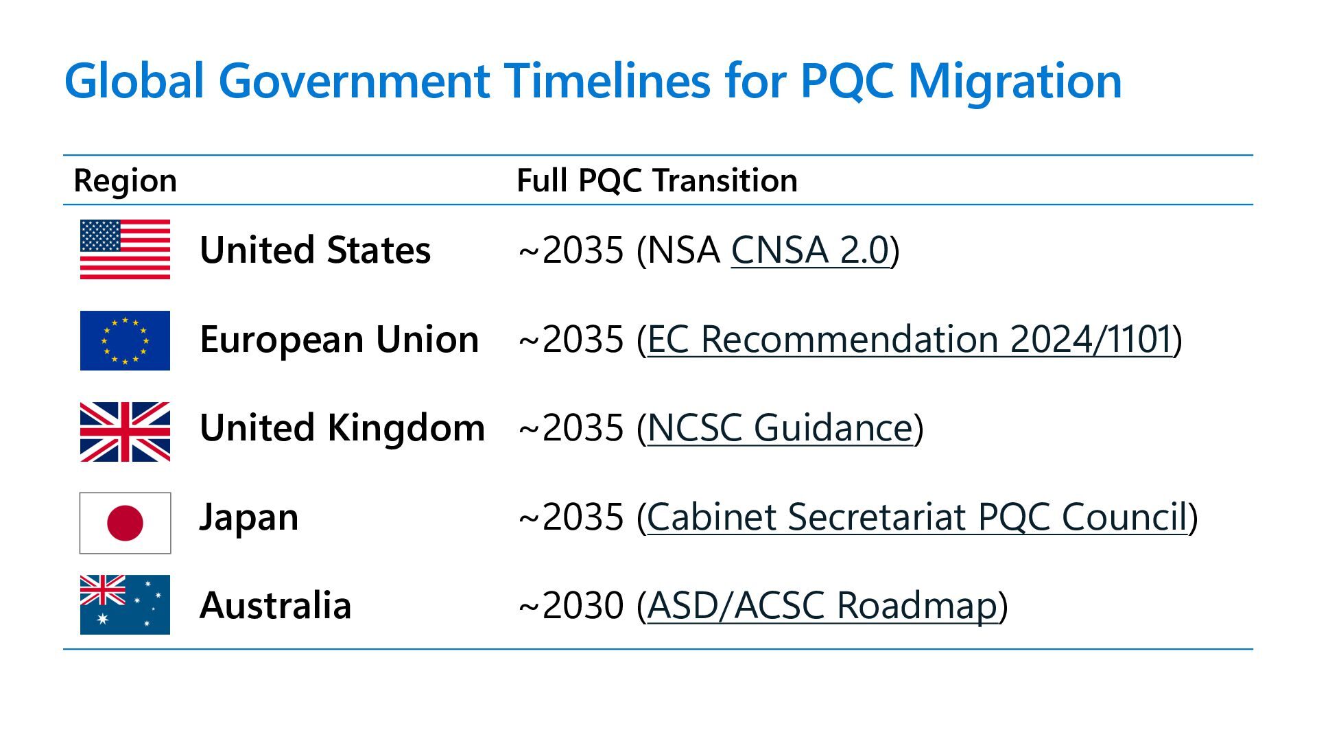 United States ~2035 (NSA CNSA 2.0) European Union ~2035 (EC Recommendation 2024/1101) United Kingdom ~2035 (NCSC Guidance) Japan ~2035 (Cabinet Secretariat PQC Council) Australia ~2030 (ASD/ACSC Roadmap)