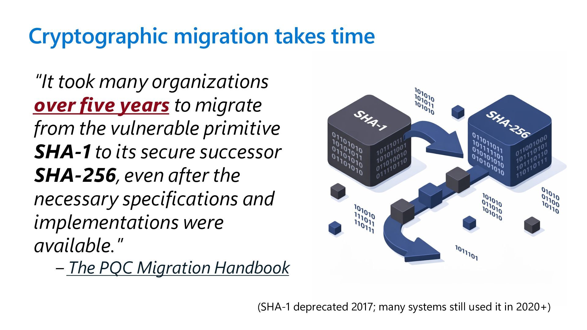 the vulnerable primitive SHA-1 to its secure successor SHA-256, even after the necessary specifications and implementations were available.” – The PQC Migration Handbook Cryptographic migration takes time (SHA-1 deprecated 2017; many systems still used it in 2020+)