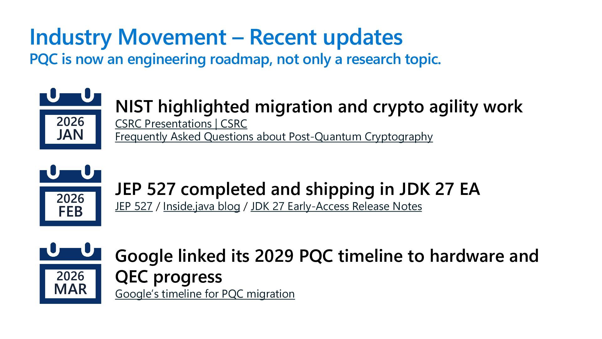roadmap, not only a research topic. 2026 JAN NIST highlighted migration and crypto agility work CSRC Presentations | CSRC Frequently Asked Questions about Post-Quantum Cryptography 2026 FEB JEP 527 completed and shipping in JDK 27 EA JEP 527 / Inside.java blog / JDK 27 Early-Access Release Notes 2026 MAR Google linked its 2029 PQC timeline to hardware and QEC progress Google’s timeline for PQC migration
