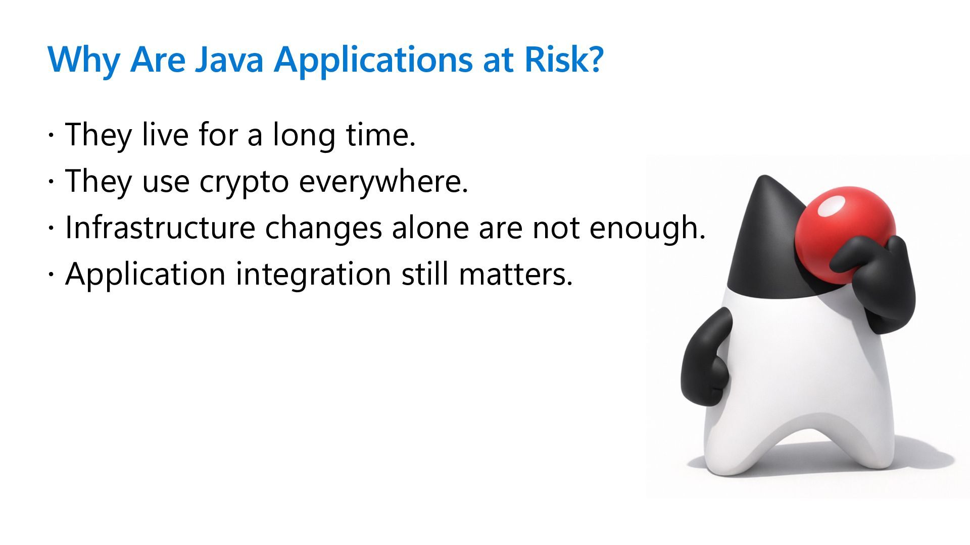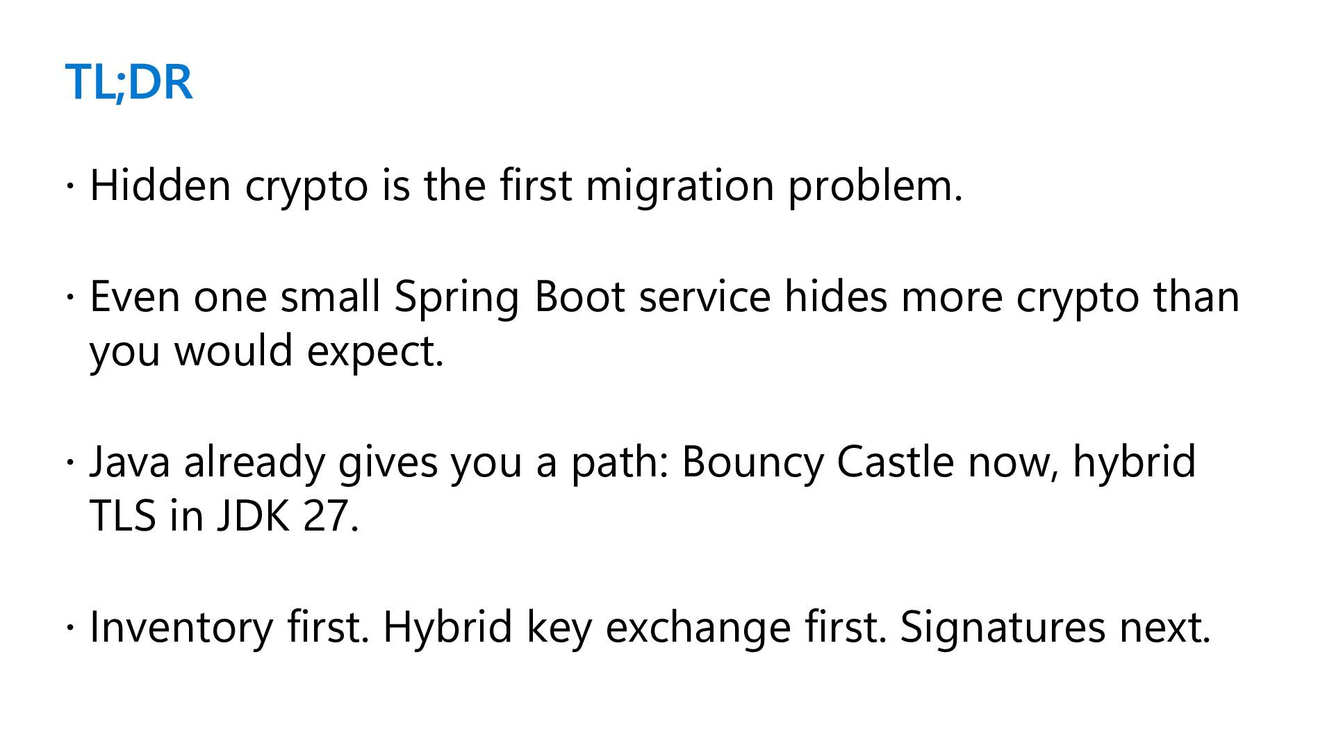 Even one small Spring Boot service hides more crypto than you would expect. ž Java already gives you a path: Bouncy Castle now, hybrid TLS in JDK 27. ž Inventory first. Hybrid key exchange first. Signatures next.