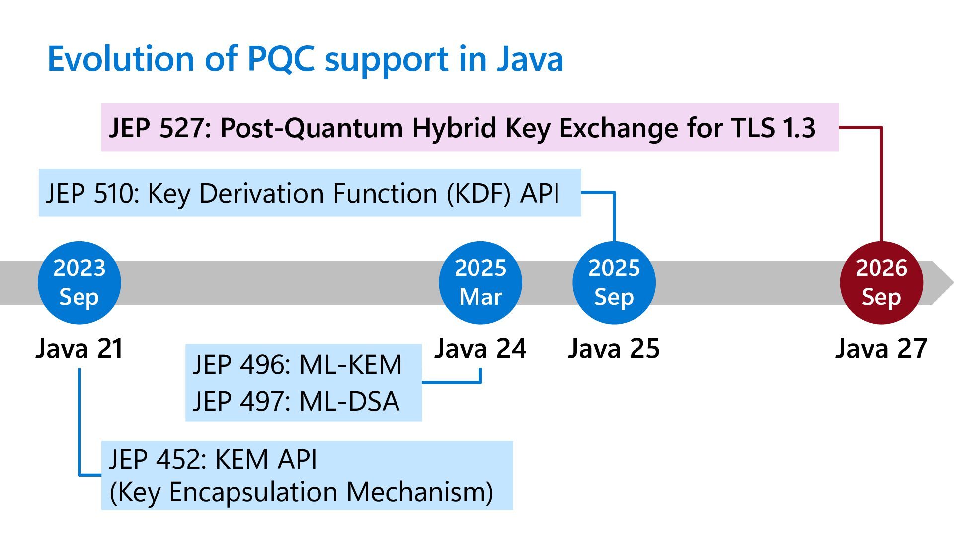 510: Key Derivation Function (KDF) API JEP 496: ML-KEM JEP 497: ML-DSA JEP 452: KEM API (Key Encapsulation Mechanism) Evolution of PQC support in Java 2023 Sep 2025 Mar 2025 Sep 2026 Sep Java 21 Java 24 Java 25 Java 27