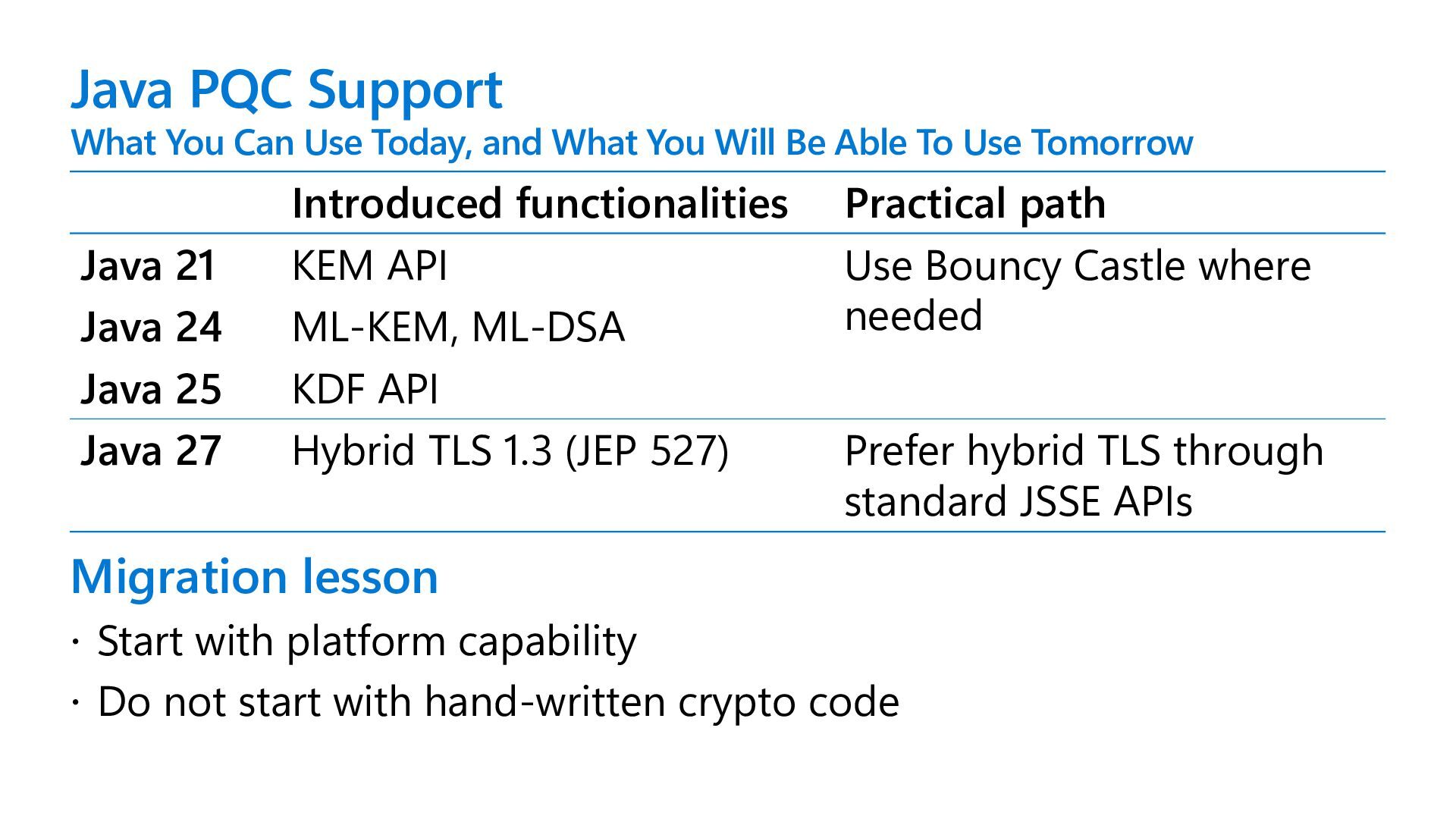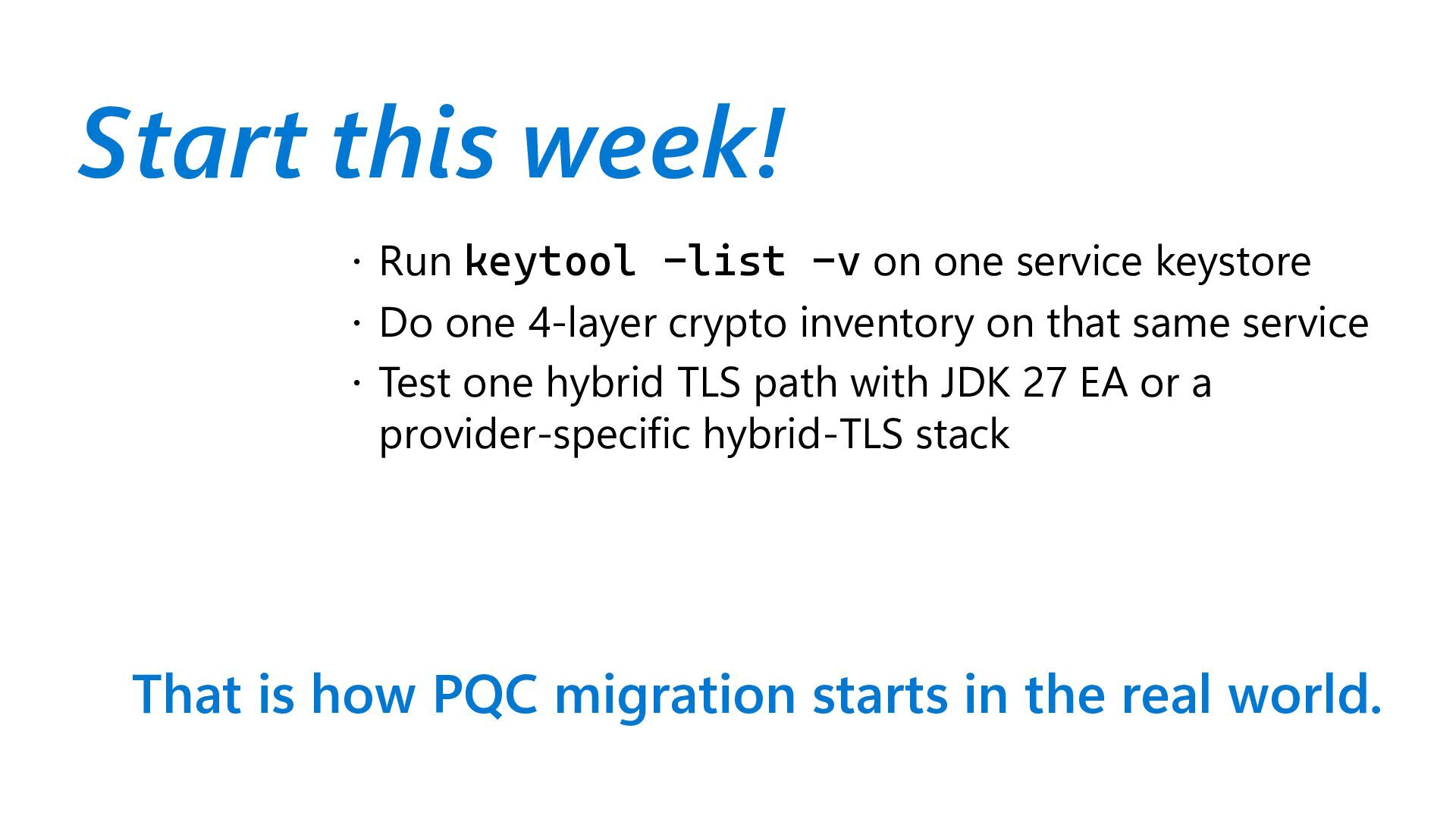 service keystore ž Do one 4-layer crypto inventory on that same service ž Test one hybrid TLS path with JDK 27 EA or a provider-specific hybrid-TLS stack That is how PQC migration starts in the real world.