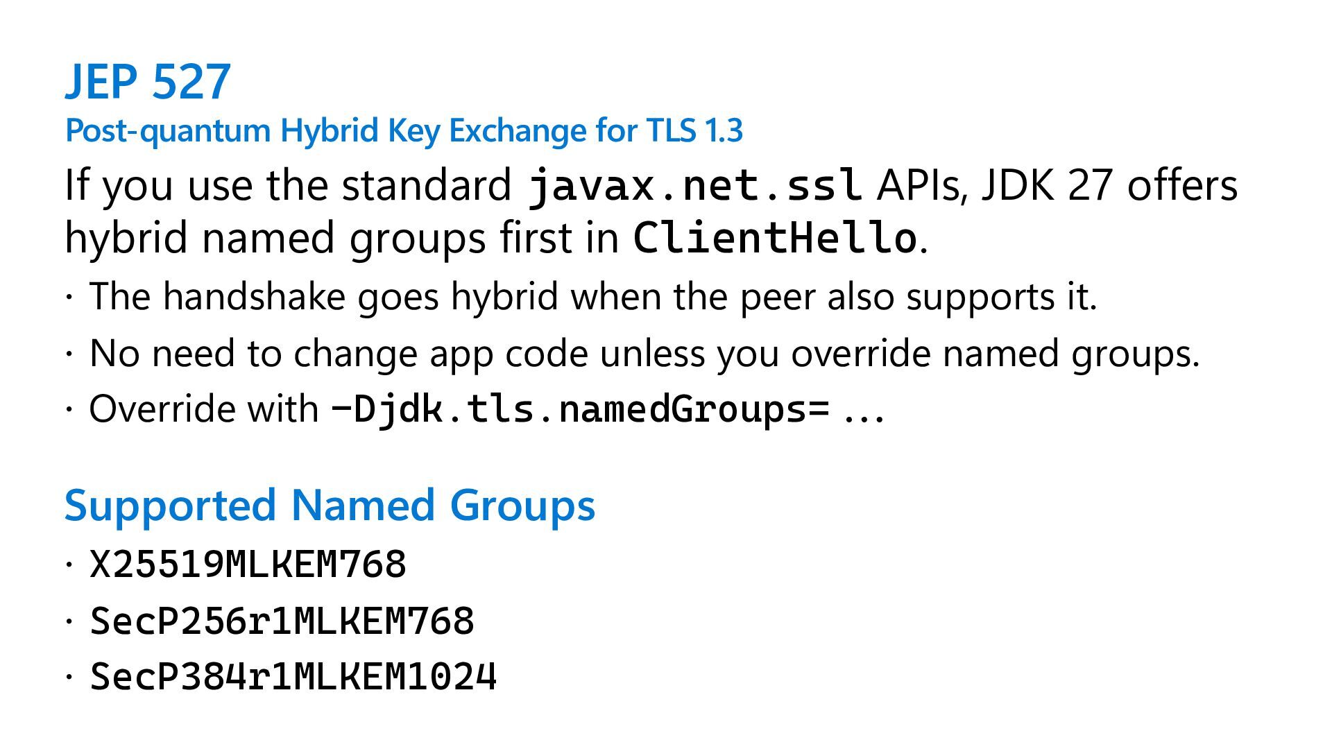 you use the standard javax.net.ssl APIs, JDK 27 offers hybrid named groups first in ClientHello. ž The handshake goes hybrid when the peer also supports it. ž No need to change app code unless you override named groups. ž Override with -Djdk.tls.namedGroups=..."" Supported Named Groups ž X25519MLKEM768 ž SecP256r1MLKEM768 ž SecP384r1MLKEM1024