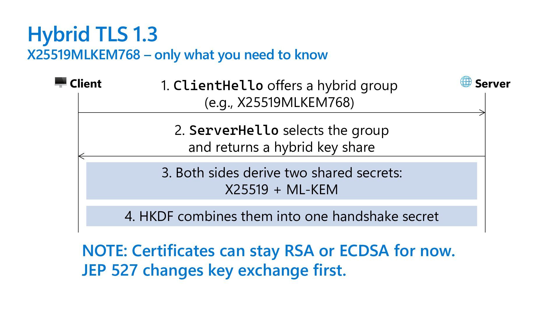 know 3. Both sides derive two shared secrets: X25519 + ML-KEM 🖥 Client 🌐 Server 2. ServerHello selects the group and returns a hybrid key share 4. HKDF combines them into one handshake secret 1. ClientHello offers a hybrid group (e.g., X25519MLKEM768) NOTE: Certificates can stay RSA or ECDSA for now. JEP 527 changes key exchange first.