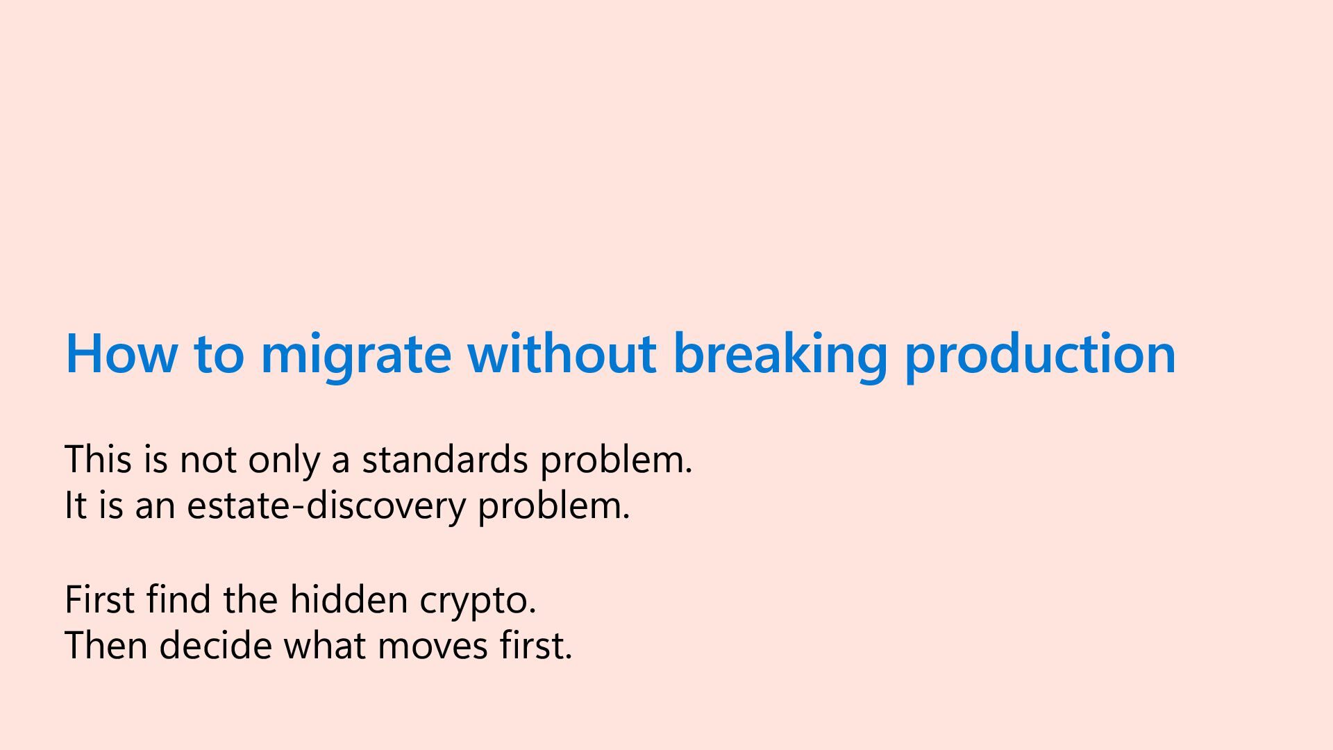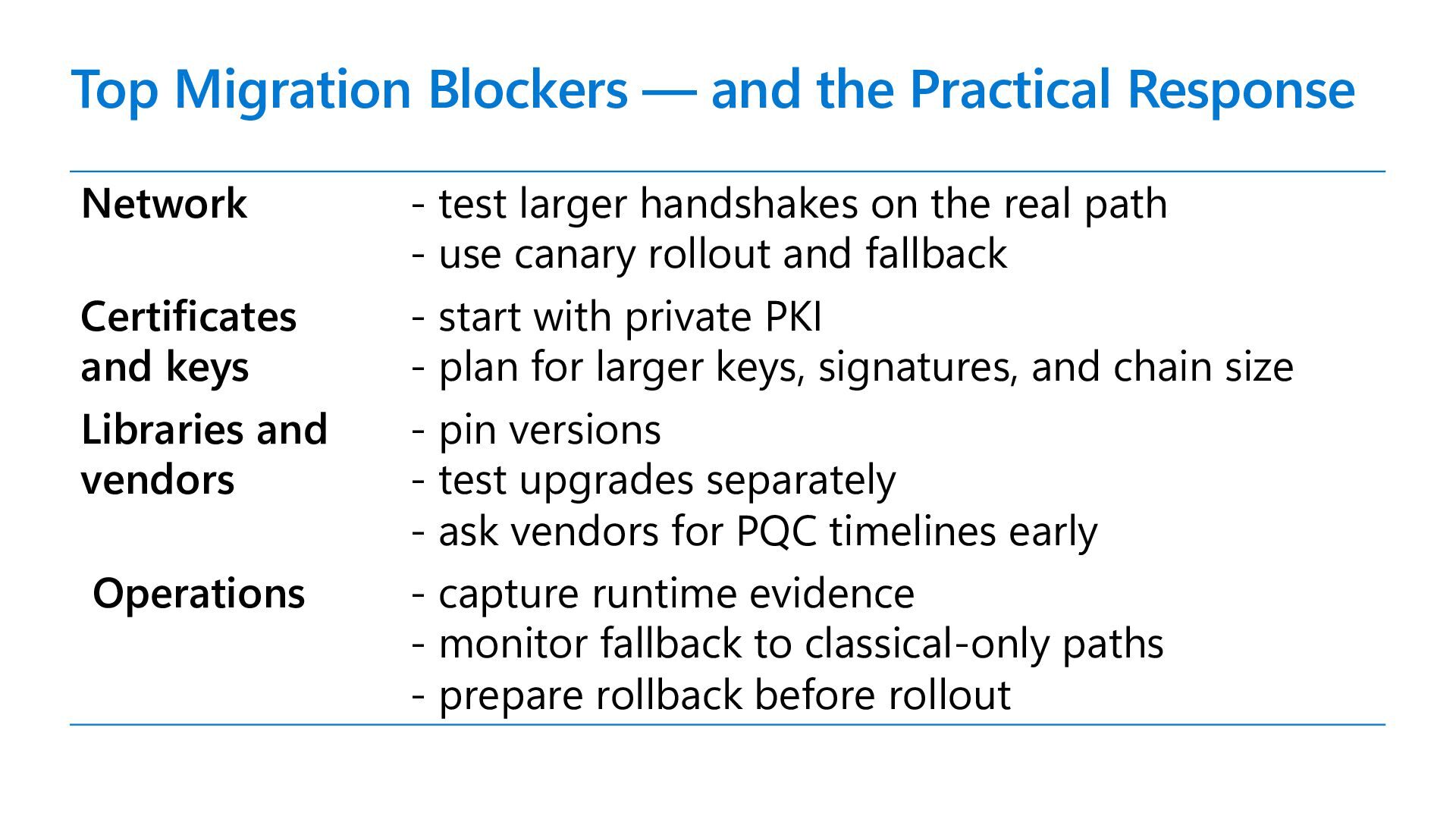 test larger handshakes on the real path - use canary rollout and fallback Certificates and keys - start with private PKI - plan for larger keys, signatures, and chain size Libraries and vendors - pin versions - test upgrades separately - ask vendors for PQC timelines early Operations - capture runtime evidence - monitor fallback to classical-only paths - prepare rollback before rollout