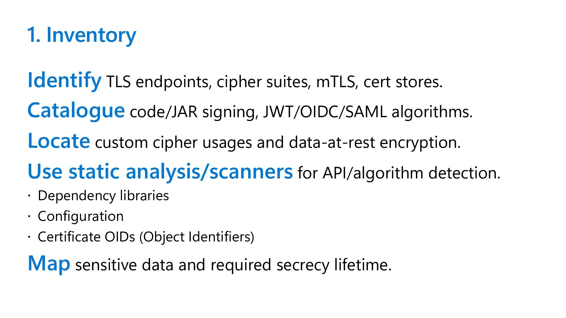 Catalogue code/JAR signing, JWT/OIDC/SAML algorithms. Locate custom cipher usages and data-at-rest encryption. Use static analysis/scanners for API/algorithm detection. ž Dependency libraries ž Configuration ž Certificate OIDs (Object Identifiers) Map sensitive data and required secrecy lifetime.