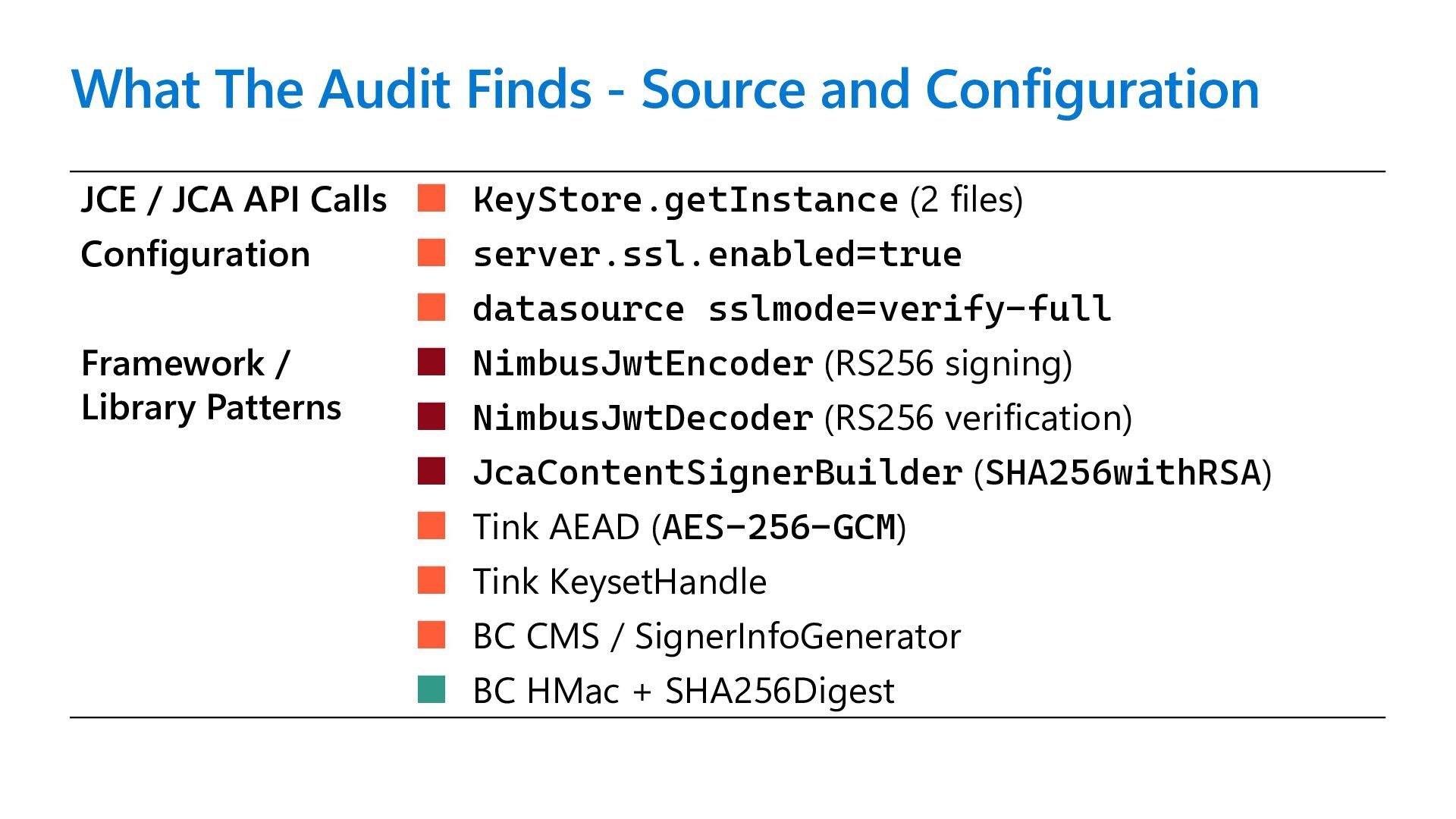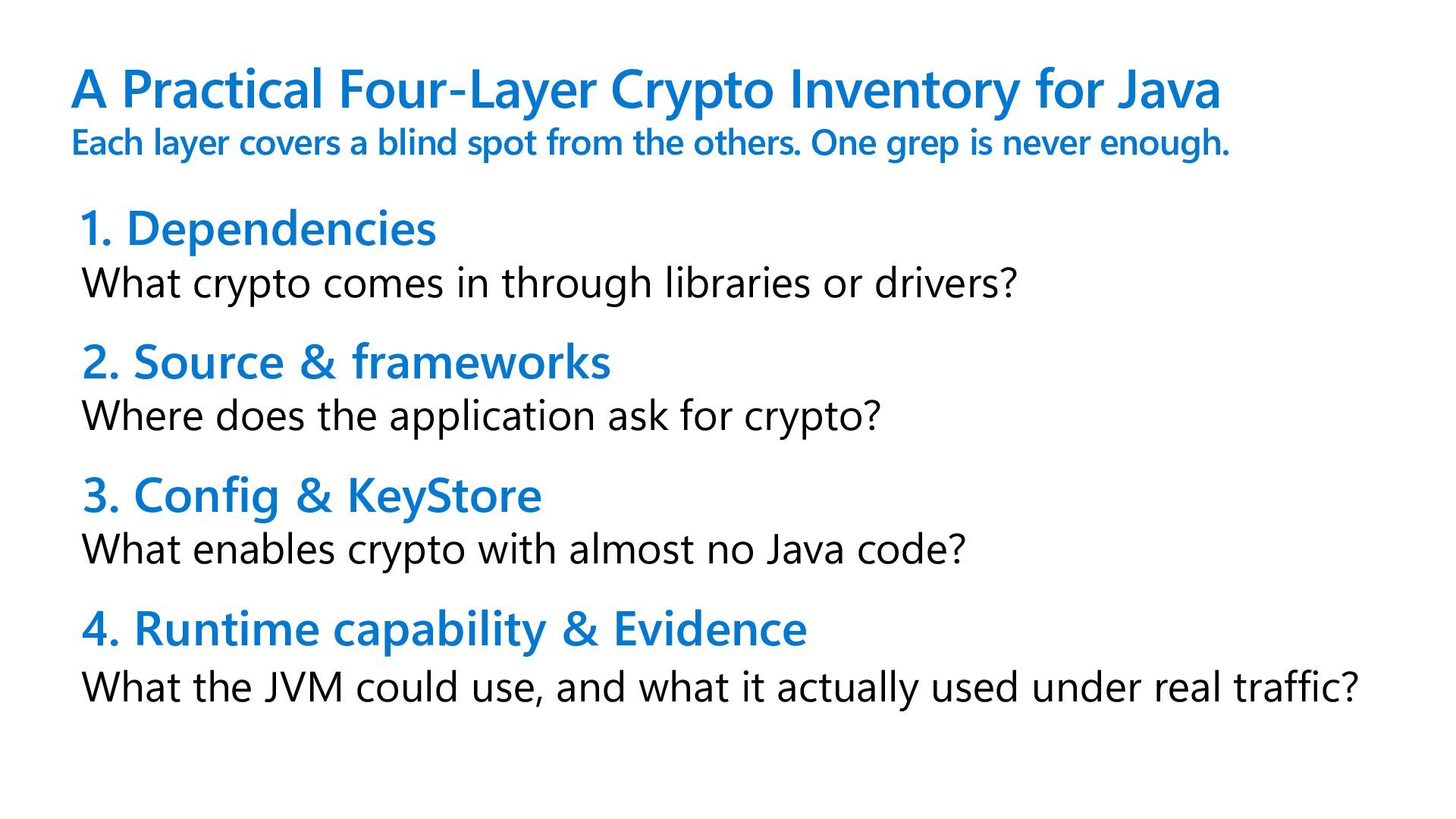 a blind spot from the others. One grep is never enough. 1. Dependencies What crypto comes in through libraries or drivers? 2. Source & frameworks 3. Config & KeyStore 4. Runtime capability & Evidence Where does the application ask for crypto? What enables crypto with almost no Java code? What the JVM could use, and what it actually used under real traffic?