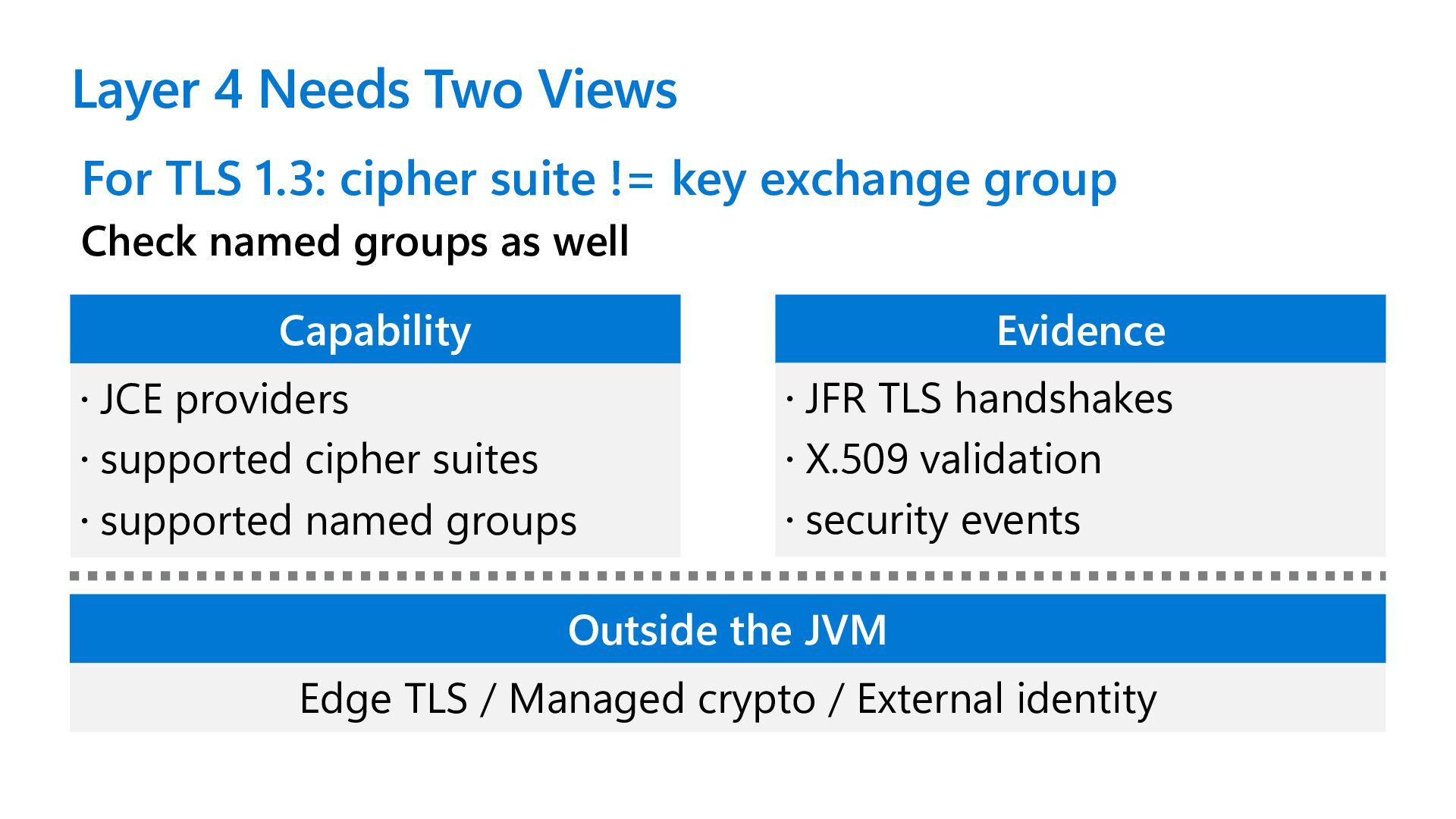 supported cipher suites ž supported named groups Evidence ž JFR TLS handshakes ž X.509 validation ž security events Outside the JVM Edge TLS / Managed crypto / External identity For TLS 1.3: cipher suite != key exchange group Check named groups as well