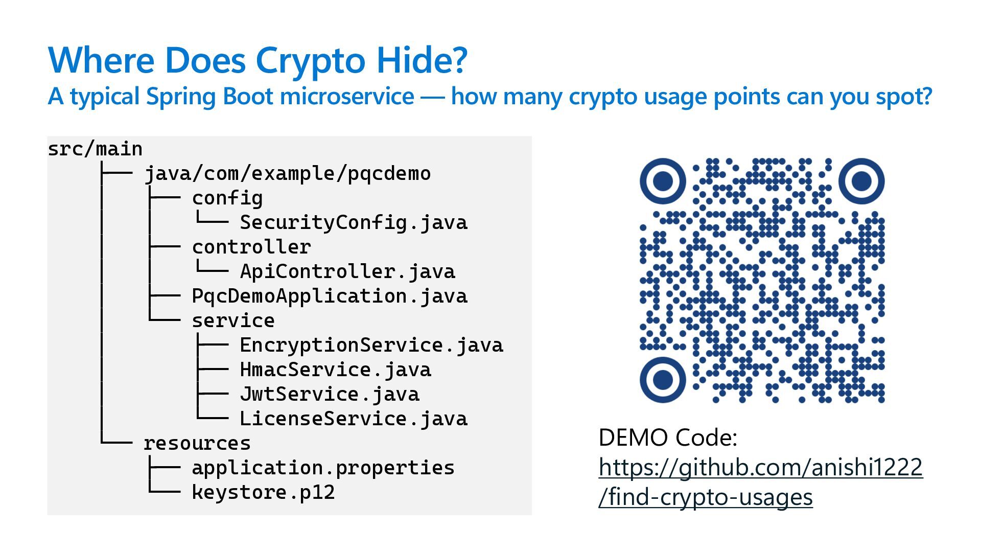 how many crypto usage points can you spot? src/main ├── java/com/example/pqcdemo │ ├── config │ │ └── SecurityConfig.java │ ├── controller │ │ └── ApiController.java │ ├── PqcDemoApplication.java │ └── service │ ├── EncryptionService.java │ ├── HmacService.java │ ├── JwtService.java │ └── LicenseService.java └── resources ├── application.properties └── keystore.p12 DEMO Code: https://github.com/anishi1222 /find-crypto-usages