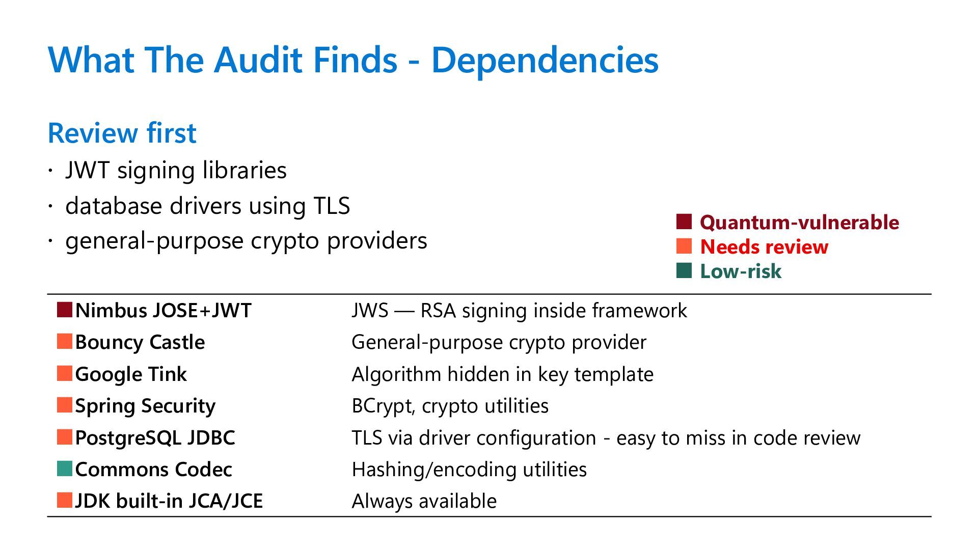 signing libraries ž database drivers using TLS ž general-purpose crypto providers ▪ Quantum-vulnerable ▪ Needs review ▪ Low-risk ▪Nimbus JOSE+JWT JWS — RSA signing inside framework ▪Bouncy Castle General-purpose crypto provider ▪Google Tink Algorithm hidden in key template ▪Spring Security BCrypt, crypto utilities ▪PostgreSQL JDBC TLS via driver configuration - easy to miss in code review ▪Commons Codec Hashing/encoding utilities ▪JDK built-in JCA/JCE Always available