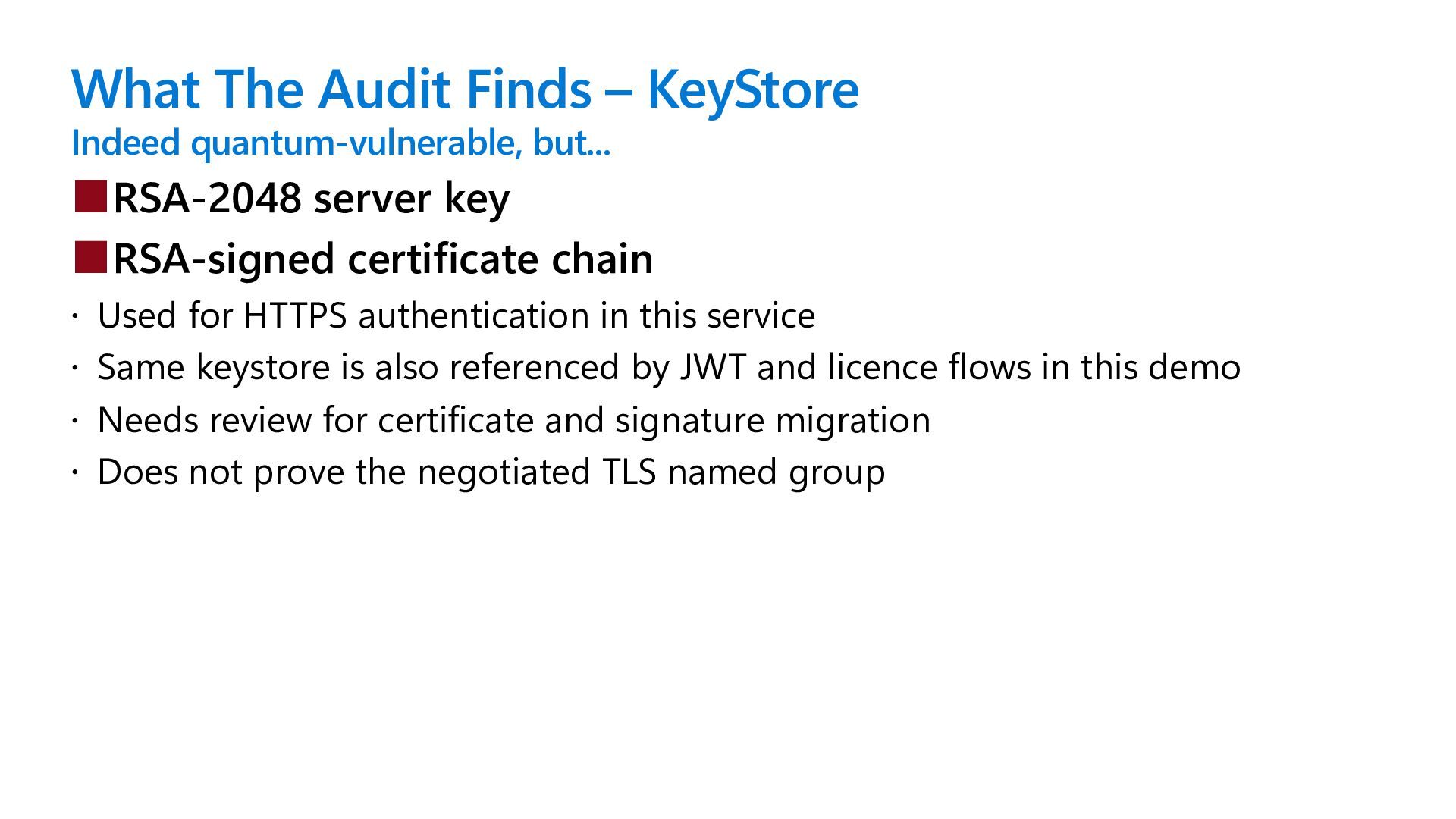 server key ▪RSA-signed certificate chain ž Used for HTTPS authentication in this service ž Same keystore is also referenced by JWT and licence flows in this demo ž Needs review for certificate and signature migration ž Does not prove the negotiated TLS named group